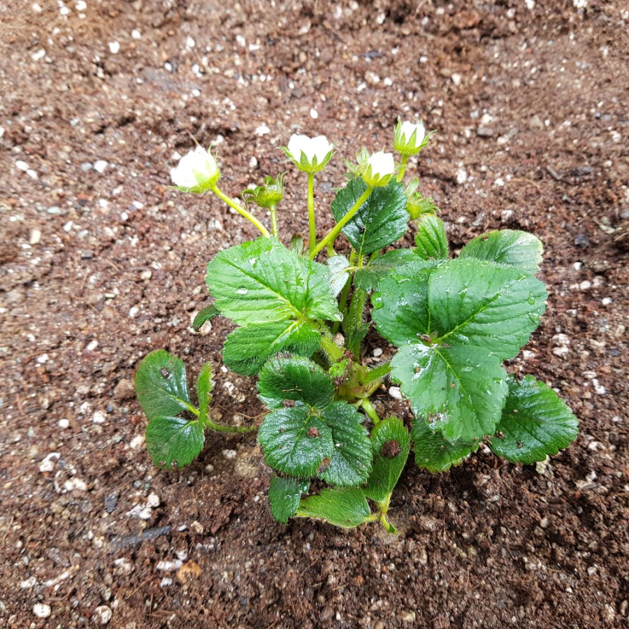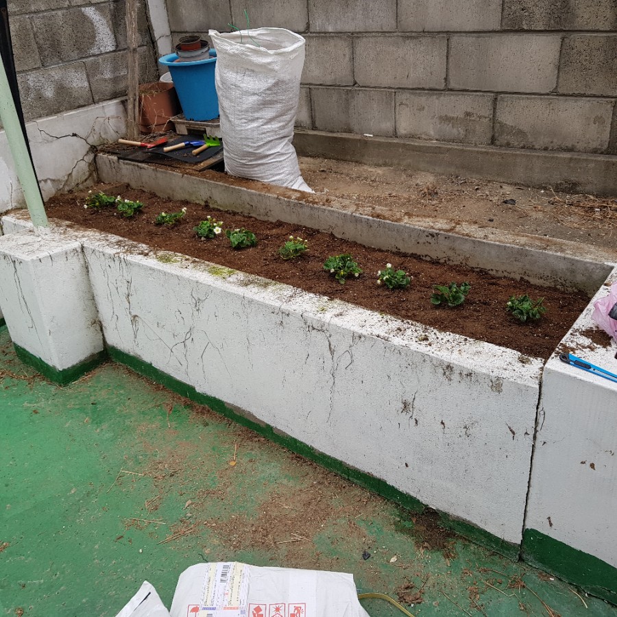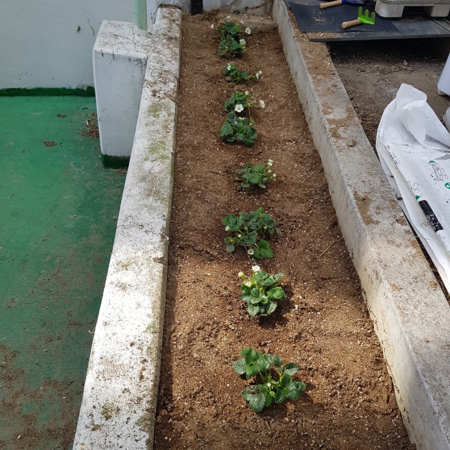 드디어 배양토가 도착했다. 돌을 치우고 풀은 걷어내고 배양토를 뿌려줬다. 그리고 정성스럽게 딸기 모종을 심었다. 10개의 모든 모종에 꽃이 피거나 꽃받침을 볼 수 있었다. 한 그루 모종에는 꽃받침이 11개나 있었다. 딸기 11개가 열릴 생각을 하니 흥분됐다. 그리고 각 모종에 물 200ml을 줬다.