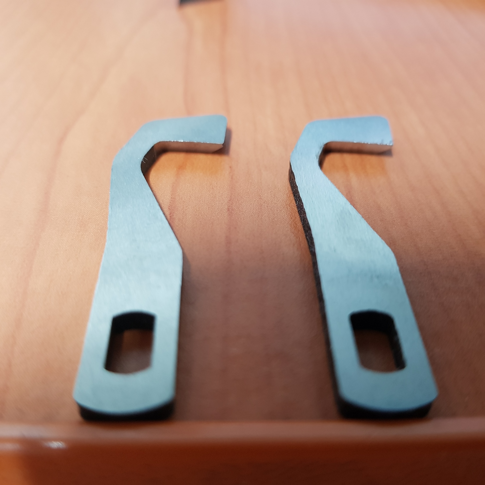 상칼을 오버룩 미싱 0115A에서 완전 분리하고 새 칼날과 비교해 봤다. 아래 사진에서 왼쪽이 새 칼날, 오른쪽이 사용한 칼날이다. 큰 차이는 없어 보인다.