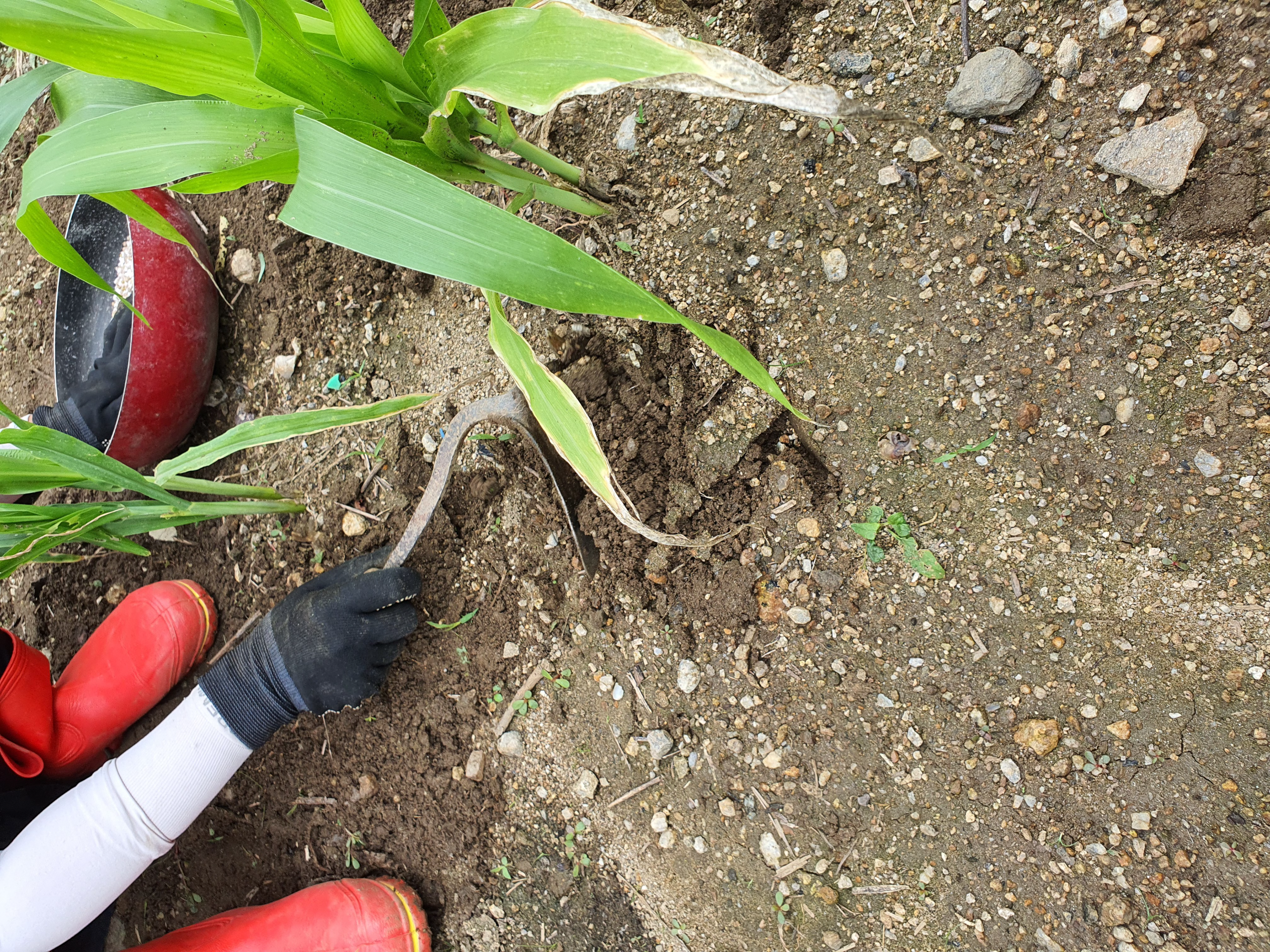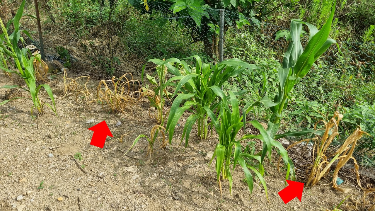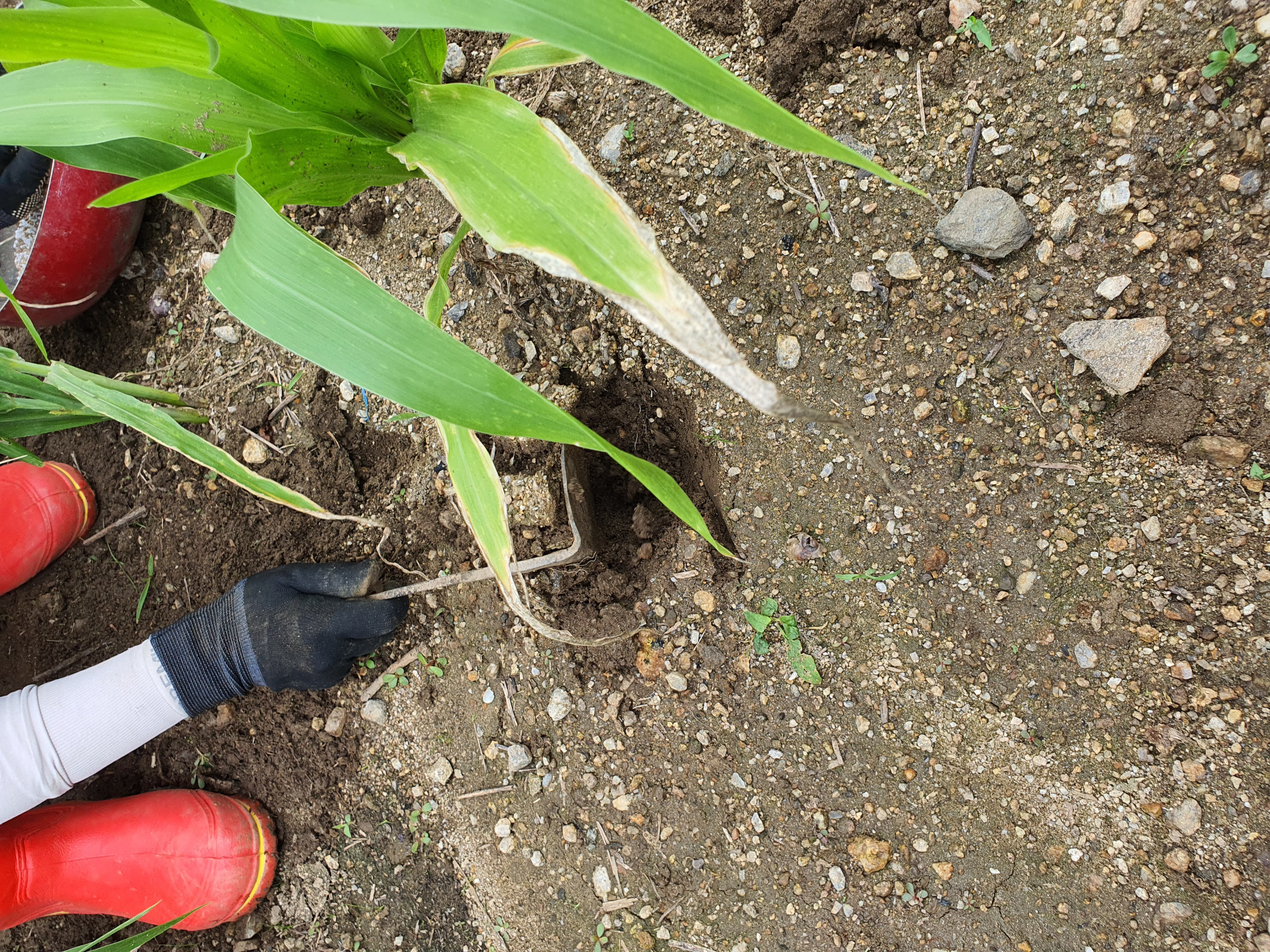 죽은 옥수수들이 많다. 위의 사진에서 빨간색 동그라미 안에 있는 옥수수들은 죽은 옥수수다. 왜 죽었는지 의문을 갖고 하나 뽑아 봤더니 뿌리도 살아있지 않았다. 뿌리까지 썩어 있었다.