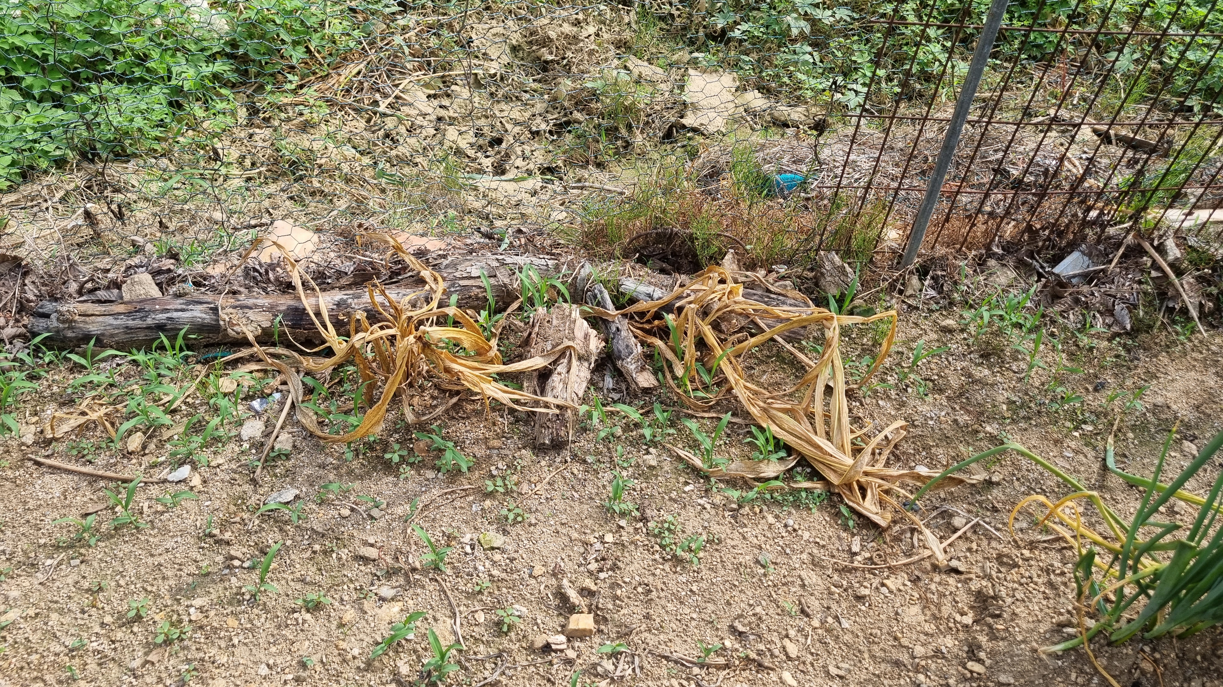 이쪽도 전멸은 아니고 울타리 쪽에 가까운 옥수수들만 죽었다. 위의 사진에서 빨간색 라인이 울타리 쪽이다. 노란색 라인에 있는 옥수수들은 멀쩡히 살아 있다. 아마도 울타리 쪽으로 풀이 많아서 그쪽에 제조제를 뿌리신 거 아닌가 추측만 한다.