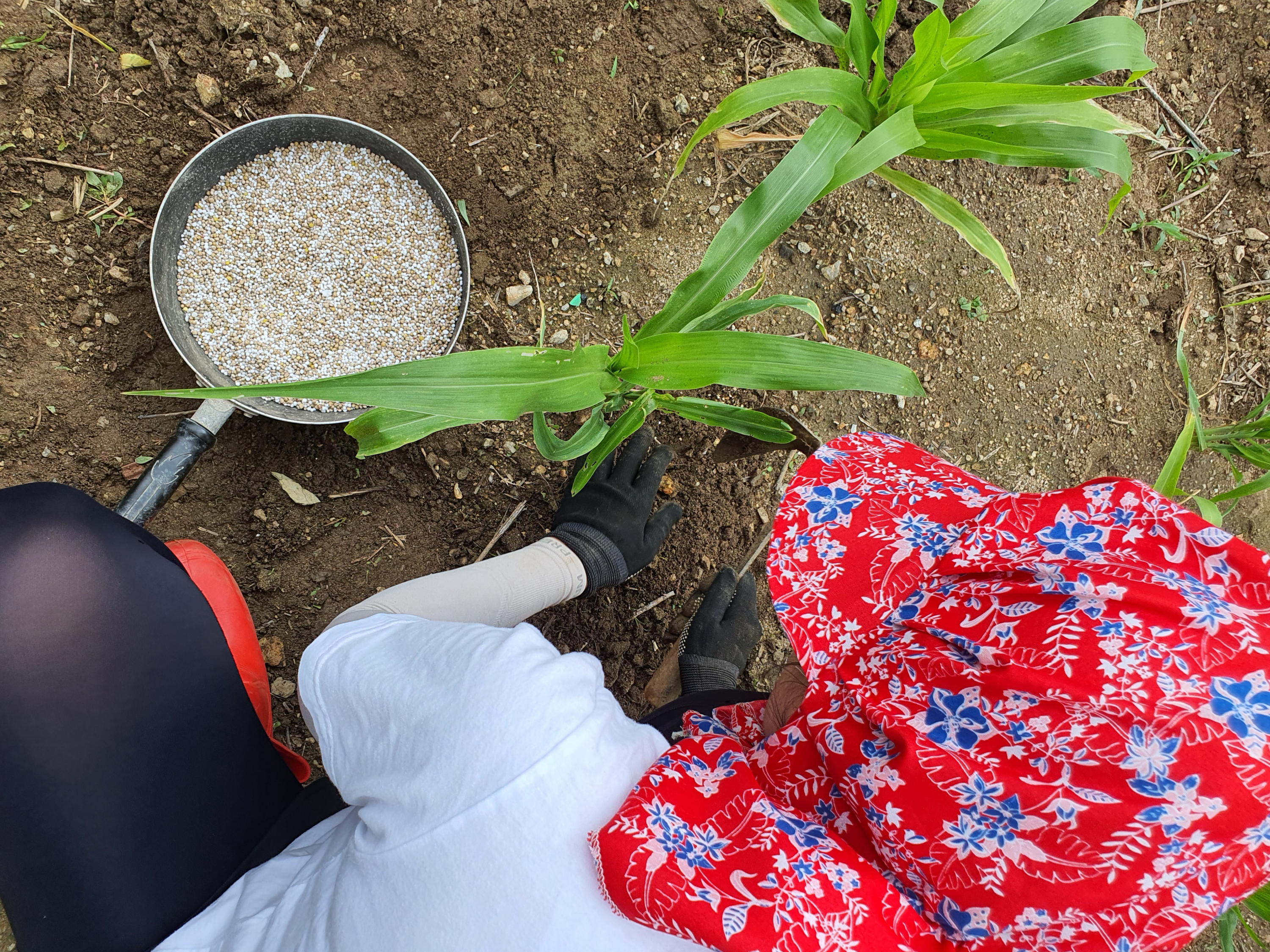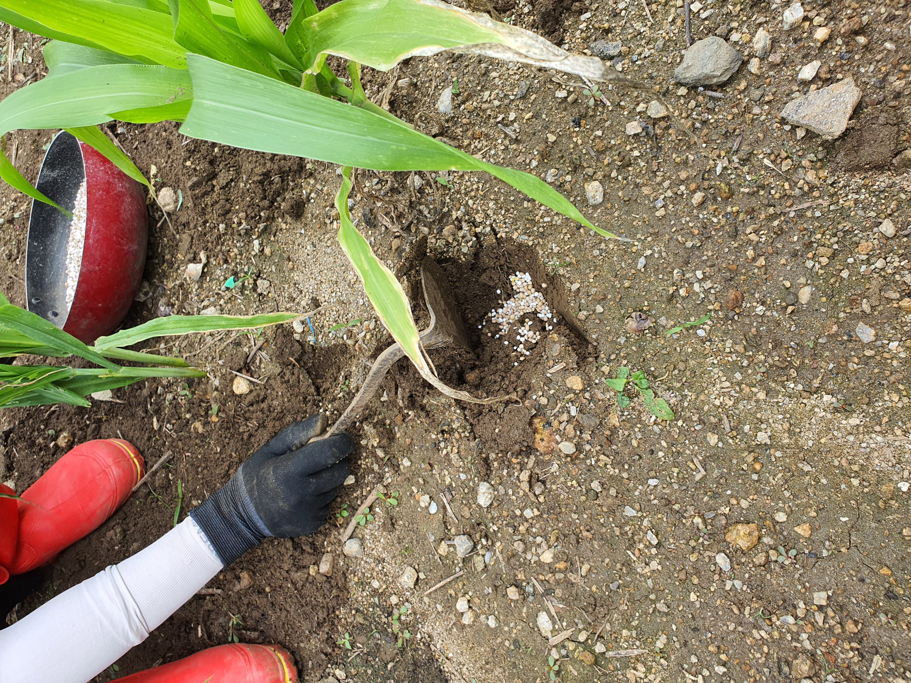 옥수수에 비료를 주고 다시 흙으로 잘 덮어준다.
