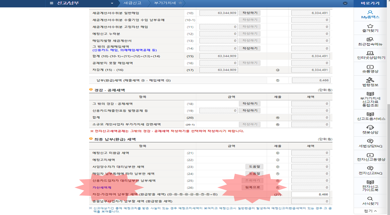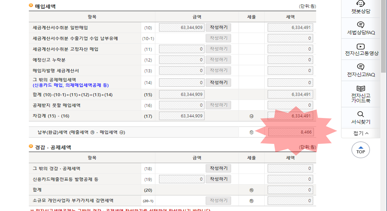 매출, 매입 세금계산서 금액을 입력하고, 신용카드 등의 사용 내역이 있으면 작성하기 버튼을 눌러 작성한다. 그러면 납부 세액이 자동으로 계산된다. 내가 납부해야 할 세액은 8,466원. 이 세액을 잘 기억한다.
