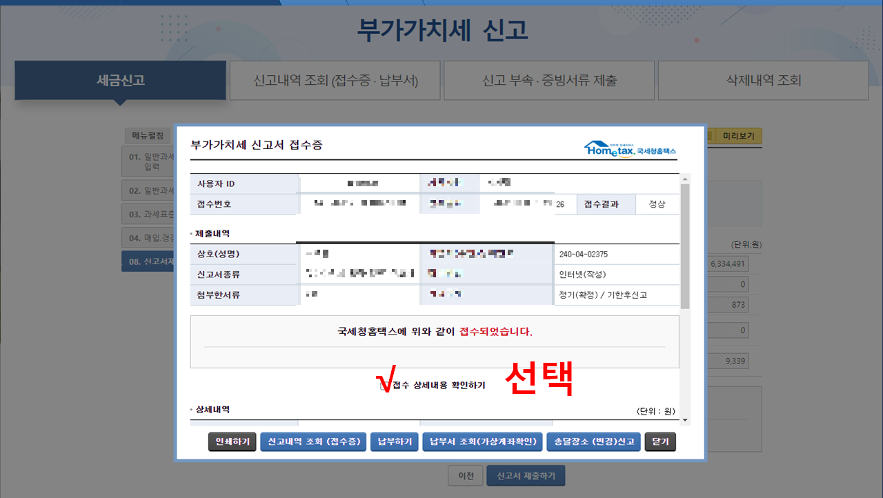 부가가치세 신고서 접수증 팝업이 뜬다. 접수 상세내용 확인하기 체크 박스에 체크를 한다.