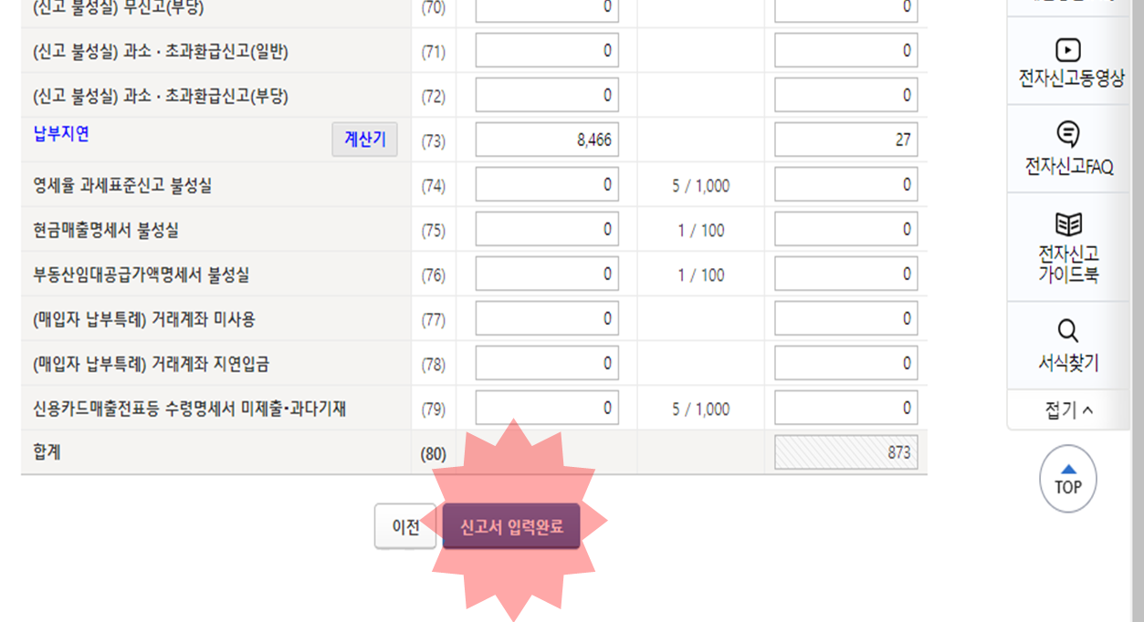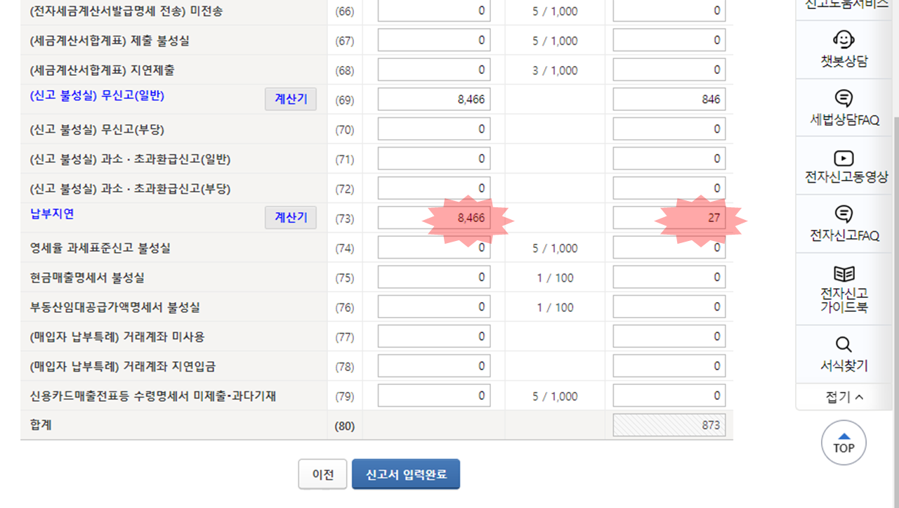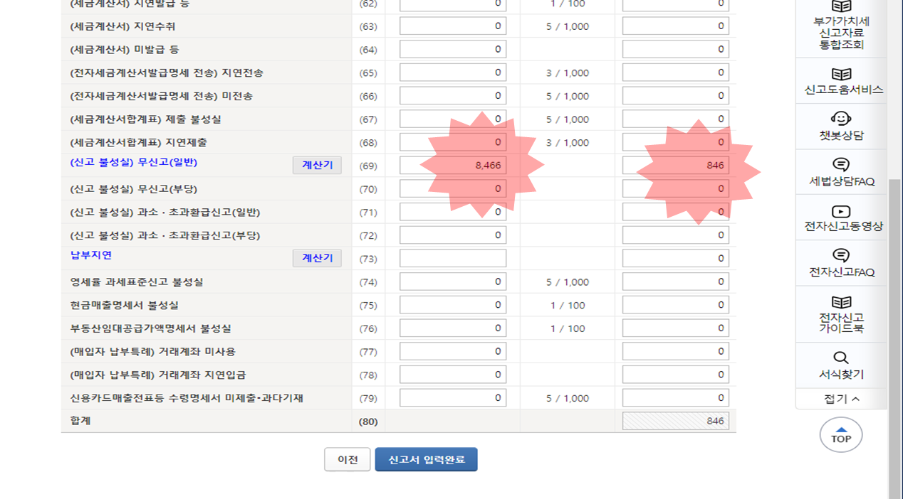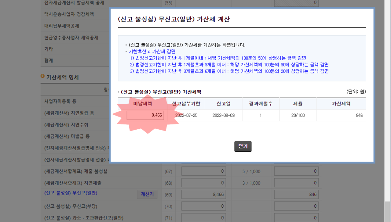 기한후 부가세 신고 대상의 하이라이트는 가산세다. 신고해야 할 기간에 신고를 하지 않았으므로 돈을 더 내라는 거다. 할 수 없이 내야 된다. 법이다. 나는 납부세액 8,466원에 대해 가산세를 내야 한다. 국세청은 친절하게도 가산세를 내라고 가산세액계를 파랑색으로 잘 보이게 표시해 준다. 기한후 부가세 신고 대상자는 가산세 입력 안 하면 제출이 안된다.