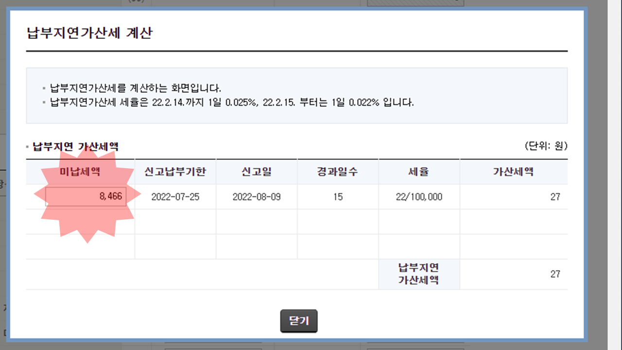 납부지연 금액란에 8,466을 입력하고 계산기에서 계산된 가산세액 27을 세액란에 입력한다.