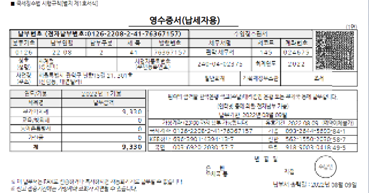 납부할 세액 목록의 체크 박스에 체크를 한다. 그리고 납부하기 버튼을 클릭하면 된다. 계좌이체, 신용카트, 체크카드로 결제할 수 있다. 다만 신용카드로 납부할 경우 납부대행 수수료가 납부세액의 0.8%를 내야 하고 체크카드는 0.5%를 내야 한다. 어차피 얼마 되지도 않는 돈이라 난 그냥 신용카드 납부를 했다. 그래서 납부대행 수수료를 납부세액의 0.8%인 74원을 더 냈다.