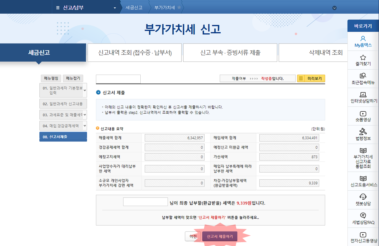 내가 납부할 세액을 확인 후 납부할 세액이 맞으면 신고서 제출하기 버튼을 클릭한다.