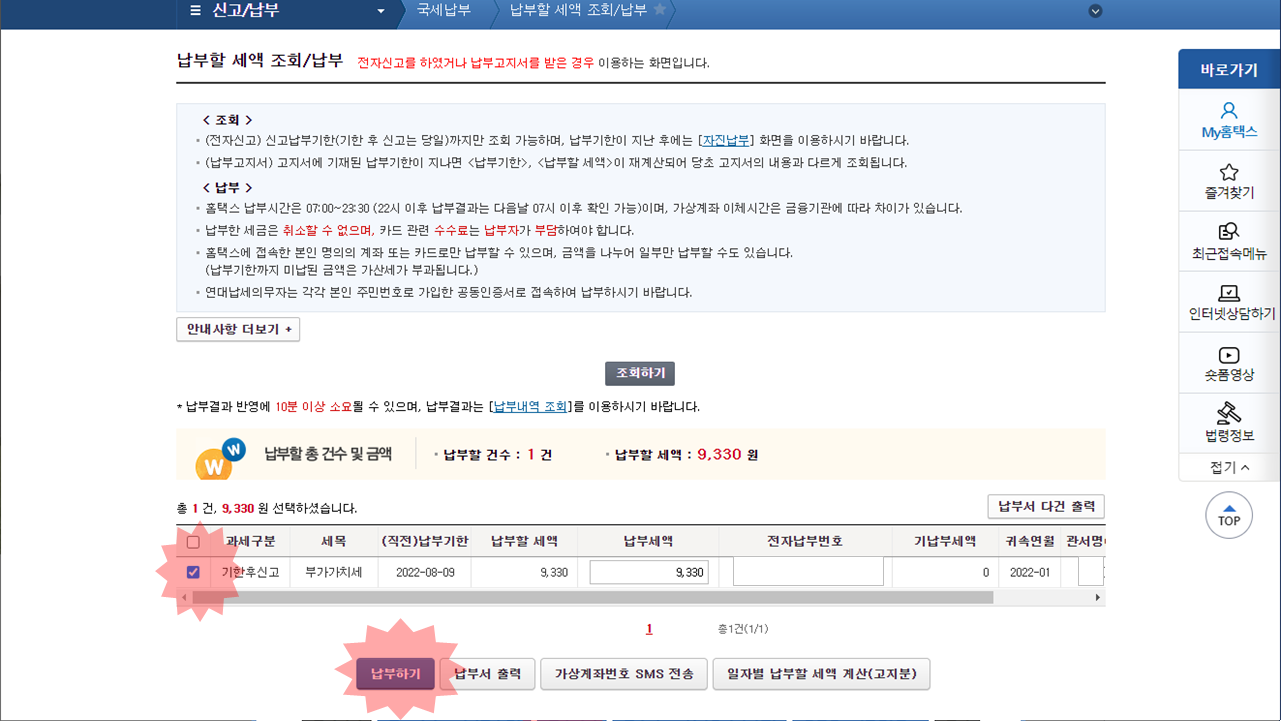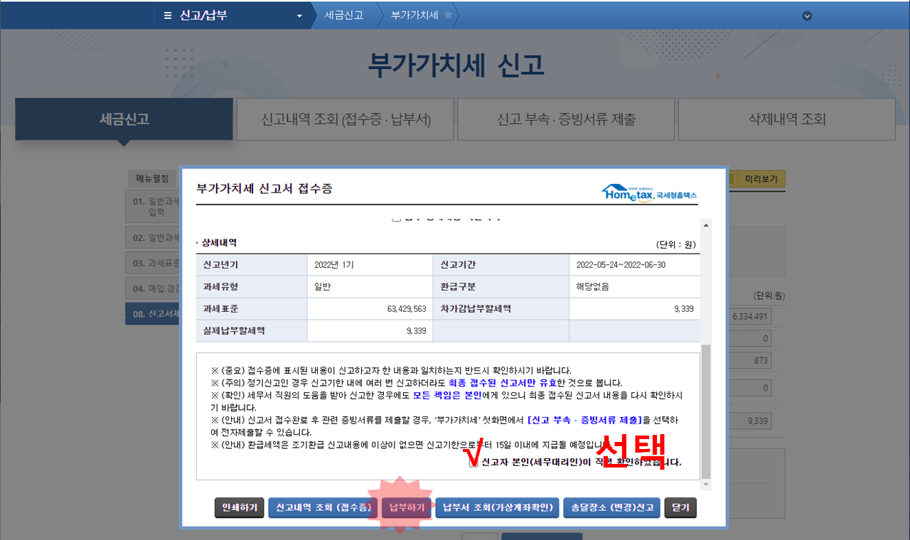 스크롤 내리면 '신고자 본인(세무대리인)이 직접 확인하였습니다'를 선택한다. 그리고 납부하기 버튼을 클릭해서 한 번에 세금 납부도 끝냈다.