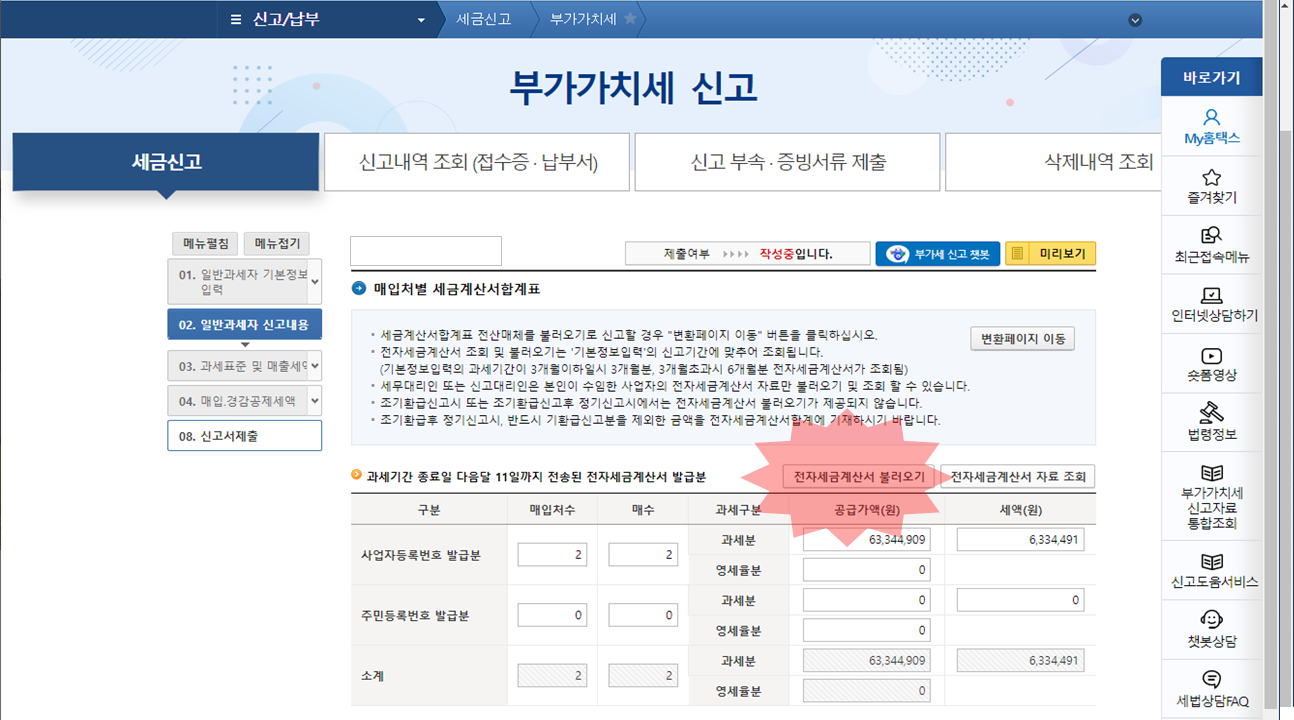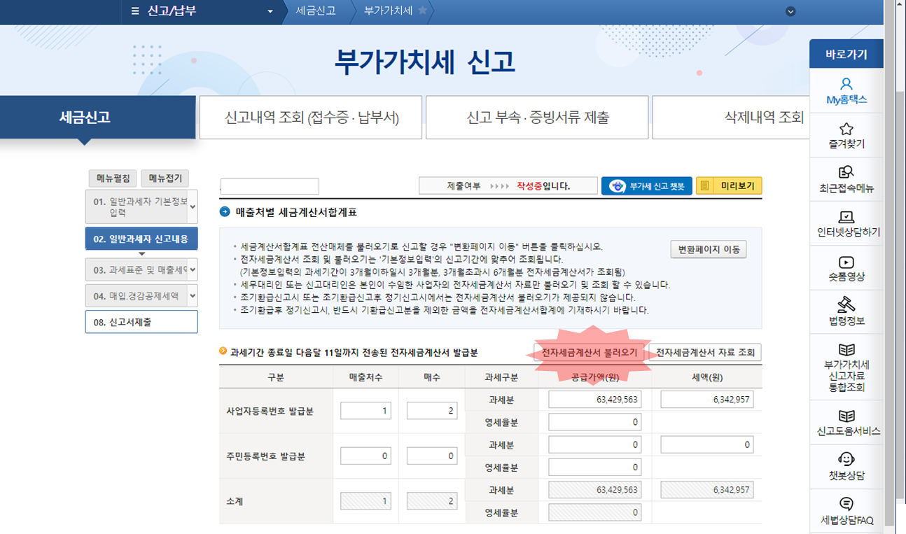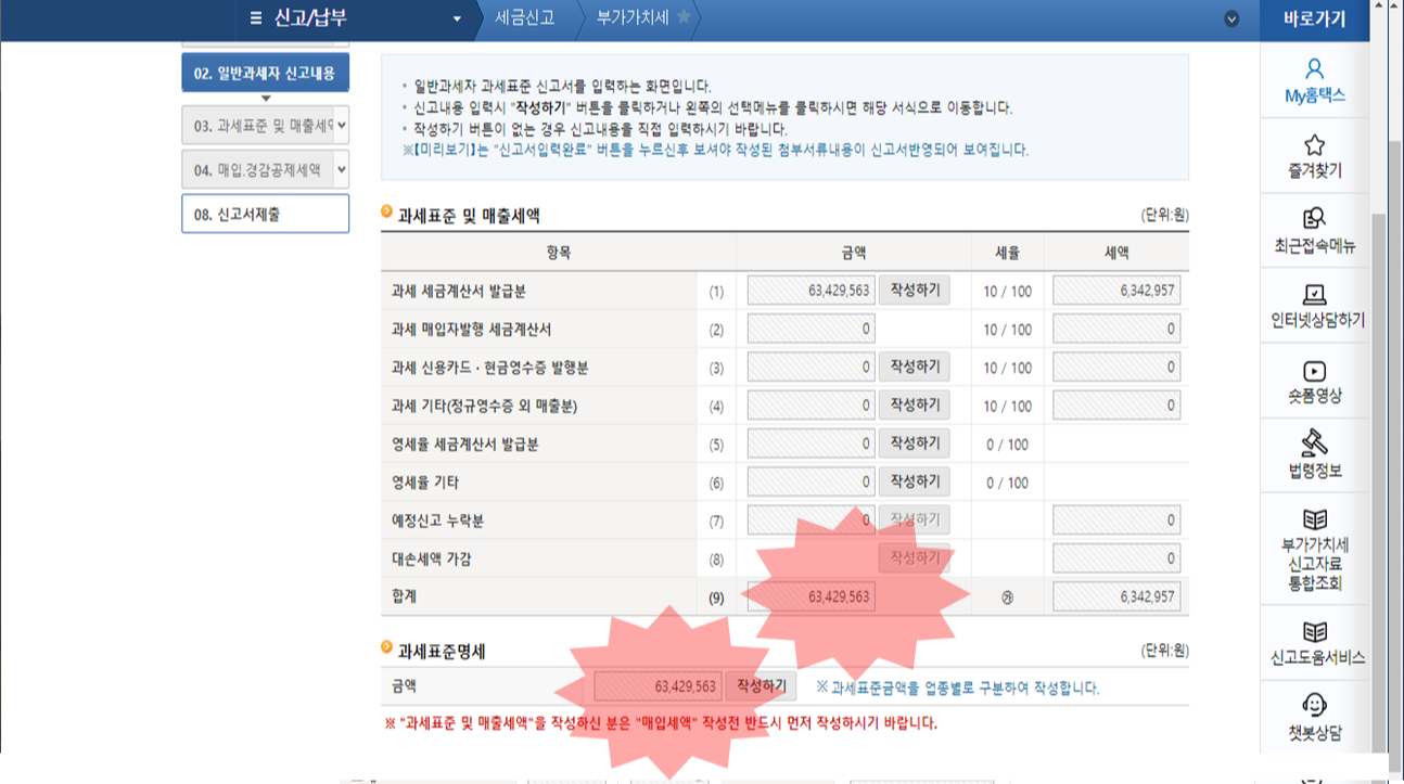 위의 사진에서 합계액과 과세표준명세 합계액이 맞는지 확인한다. 이거 안 맞으면 오류로 제출이 되지 않는다.