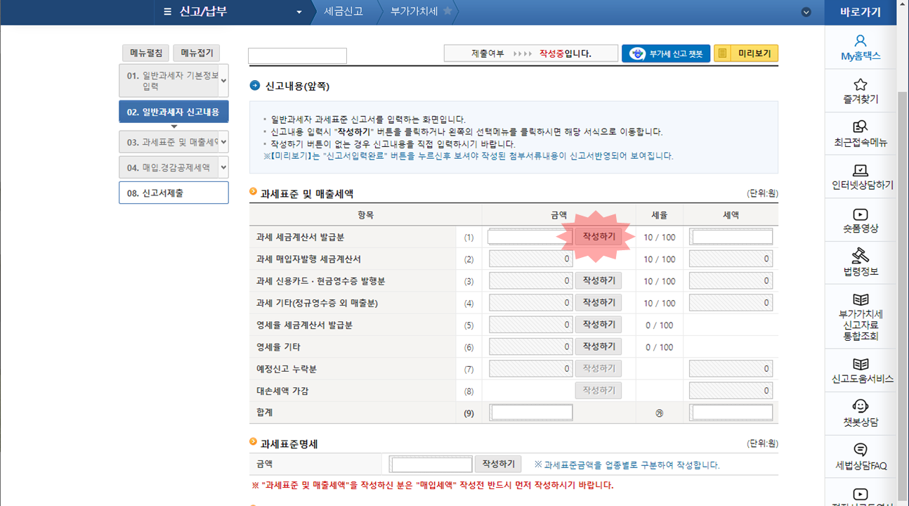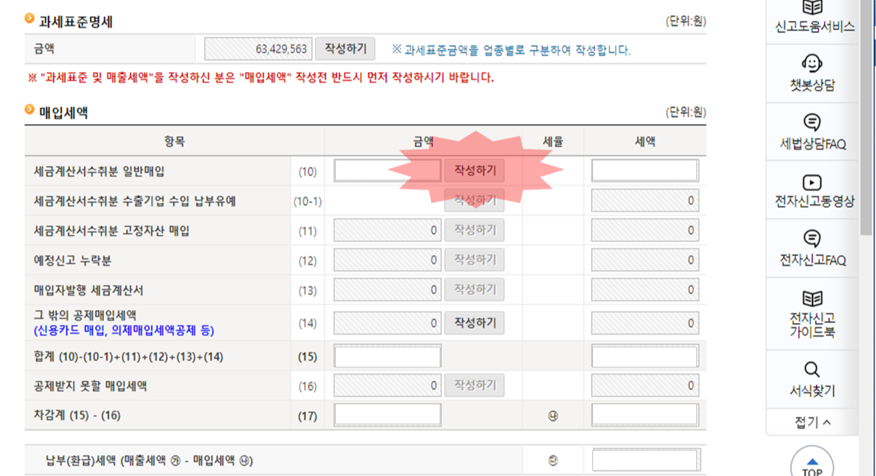 과세표준 및 매출세액에서 과세 세금계산서 발급분에 작성하기 버튼을 누른다.