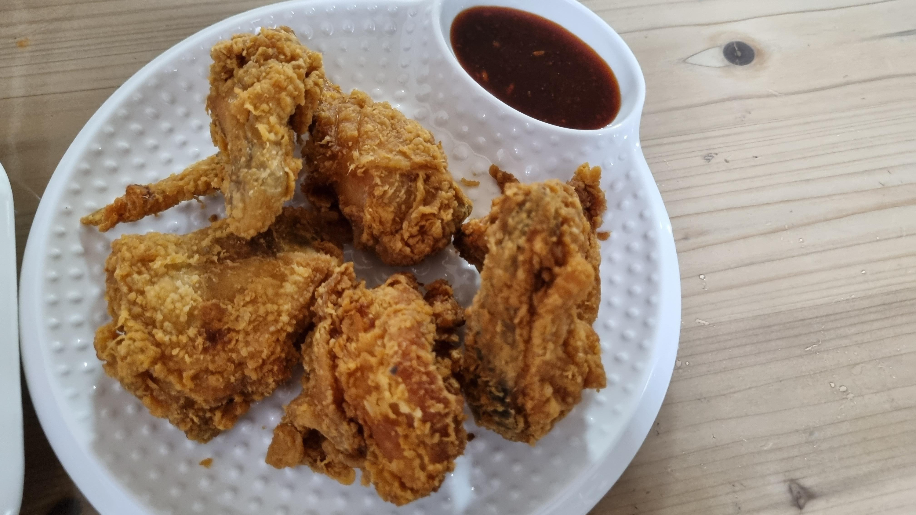 후라이드 치킨도 접시에 담았다. D진다 소스와 함께. 유튜버들이 그러는데 후라이드 참 잘하는 집 이름답게 후라이드 치킨은 맛이 보장되어 있다고 했다.