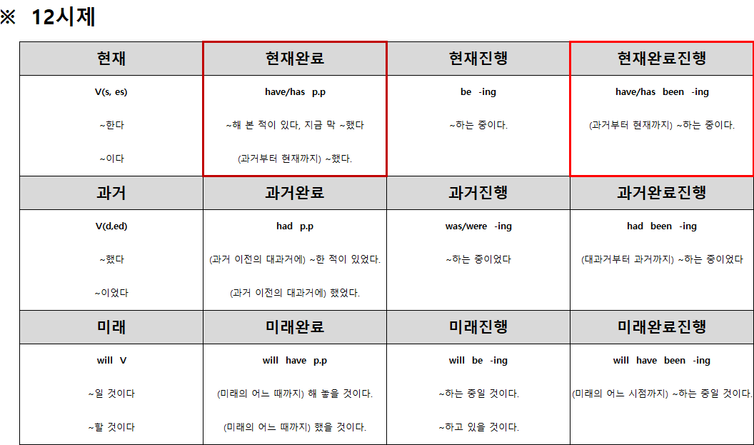 - 계속: 계속 ~하고 있다. for(~동안), since(이후로) 많이 씀.