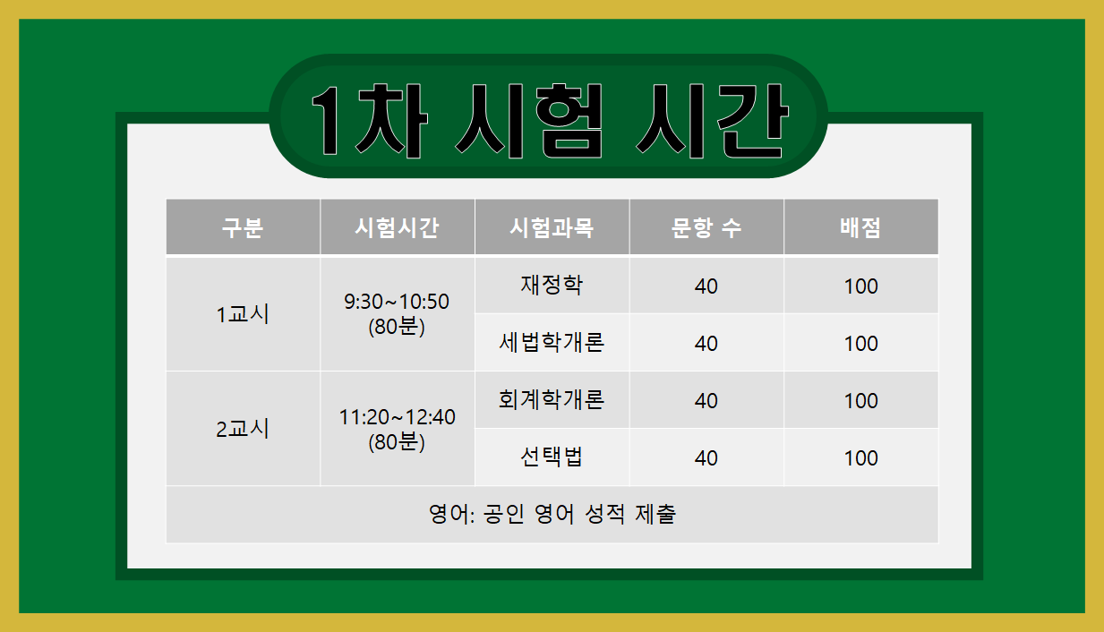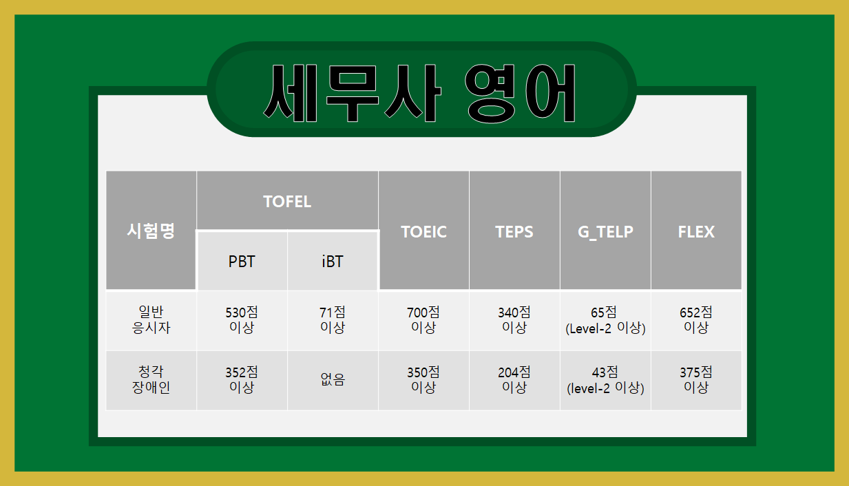 세무사 영어 시험은 공인 영어 성적을 제출 기한에 제출해야 한다. 1차 시험에서 영어 시험을 보는 것이 아니다. 공인 영어 성적 없으면 안 됨.