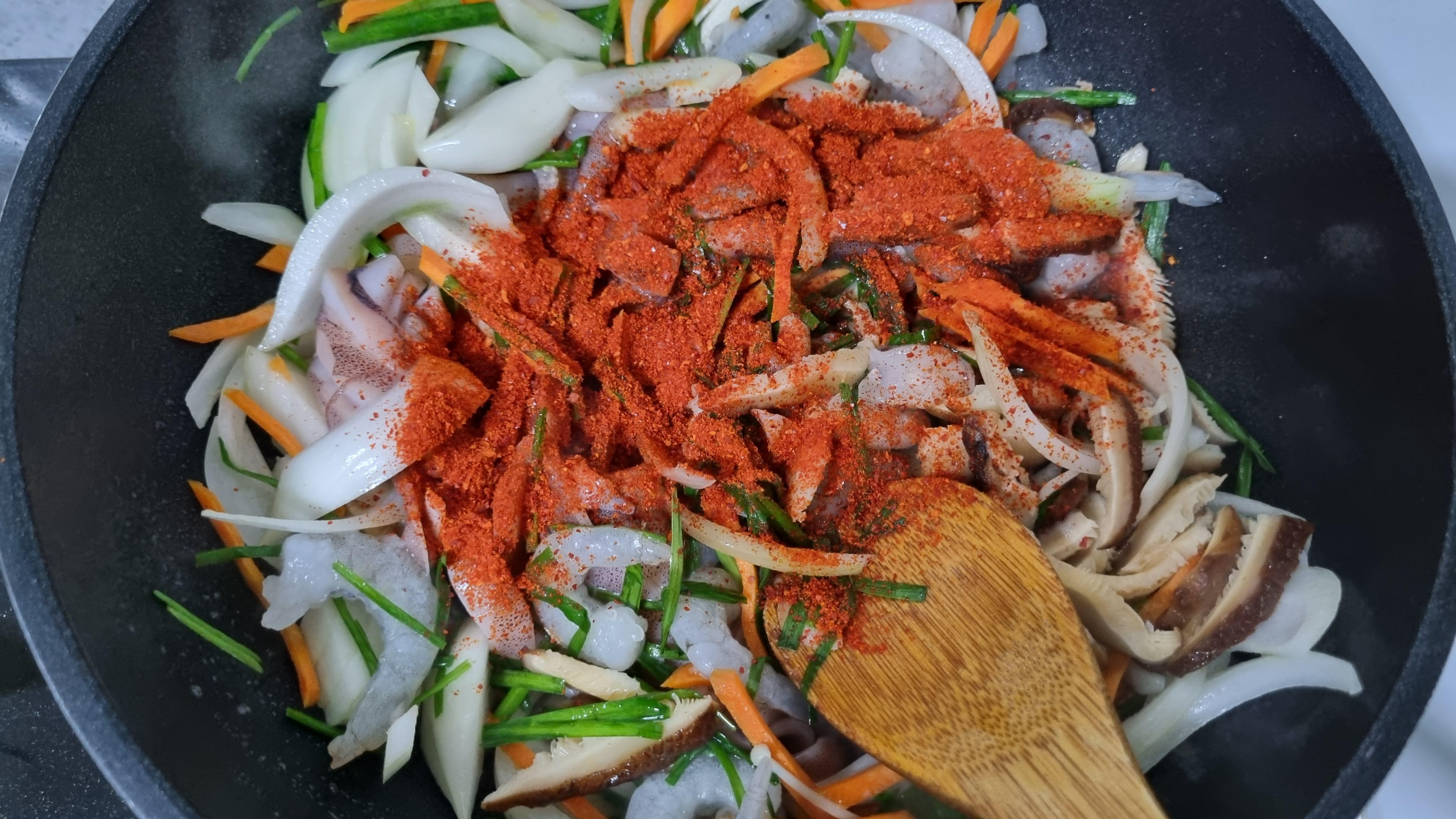 고춧가루 넣었다. 고춧가루는 넣지 않아도 된다. 거의 모든 사람들은 고춧가를 넣지 않는다. 하지만 난 약간 매콤하고 색깔도 누런색보다 약간 붉은색이 더 맛있게 보여서 고춧가루를 넣었다.