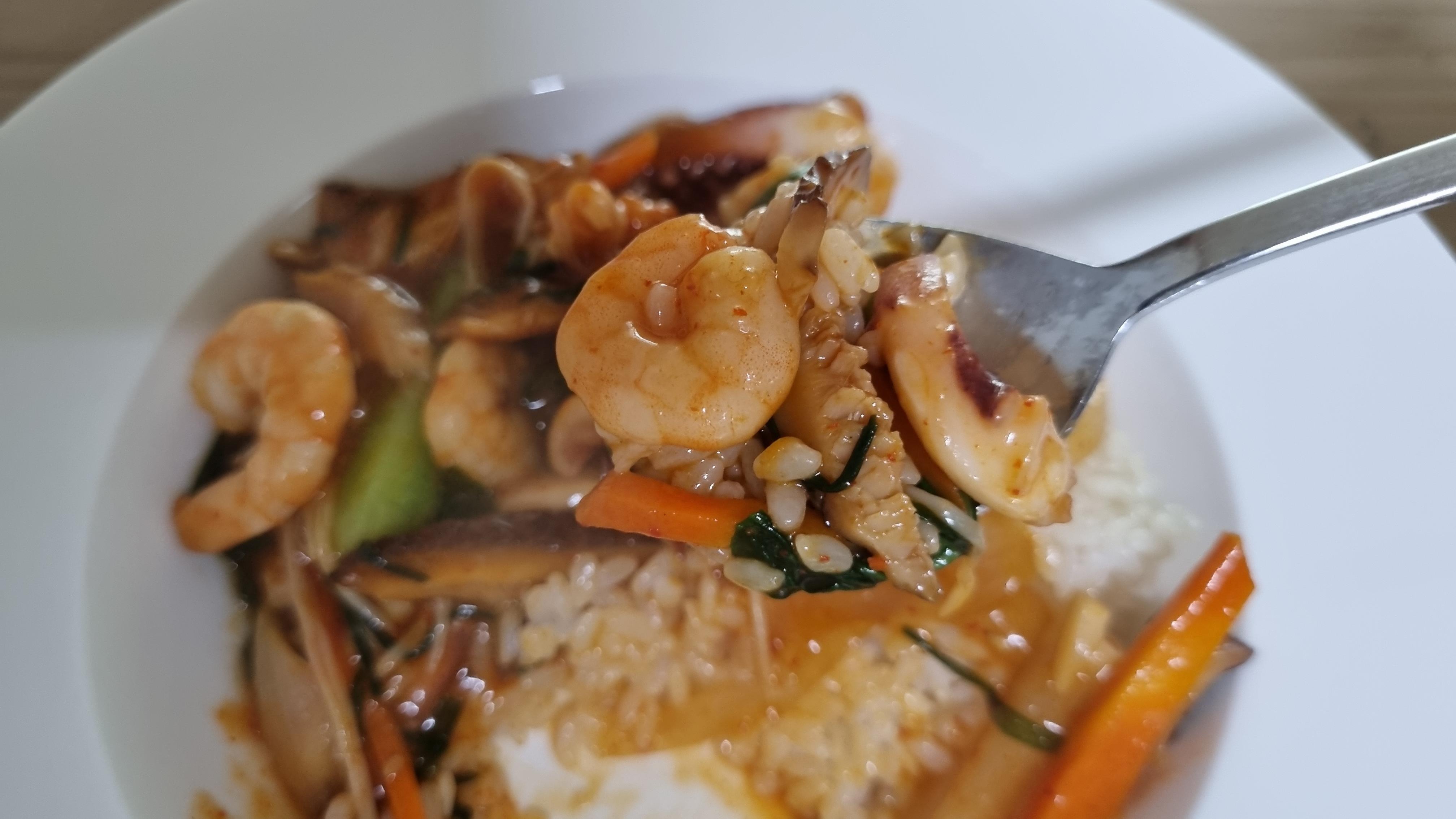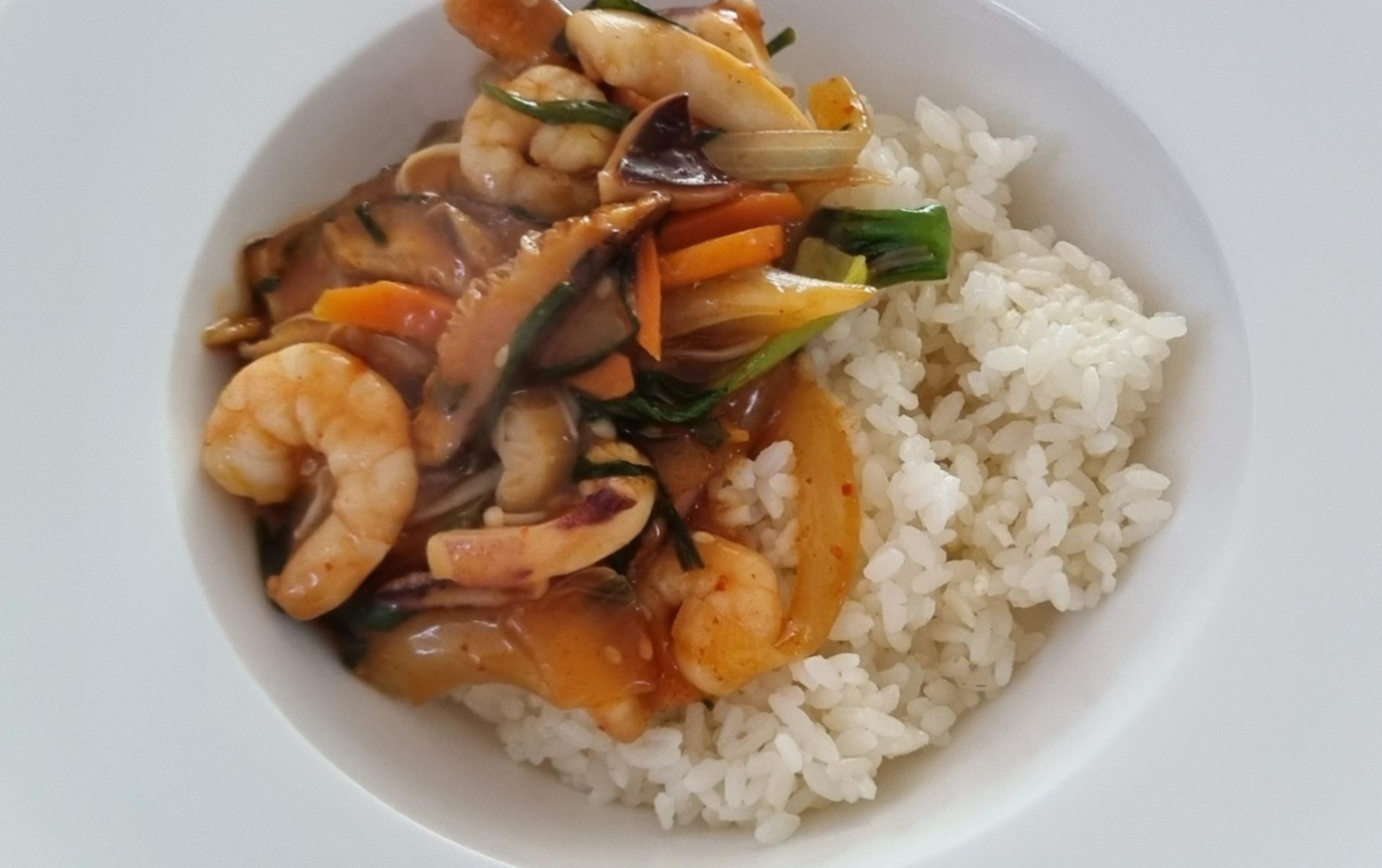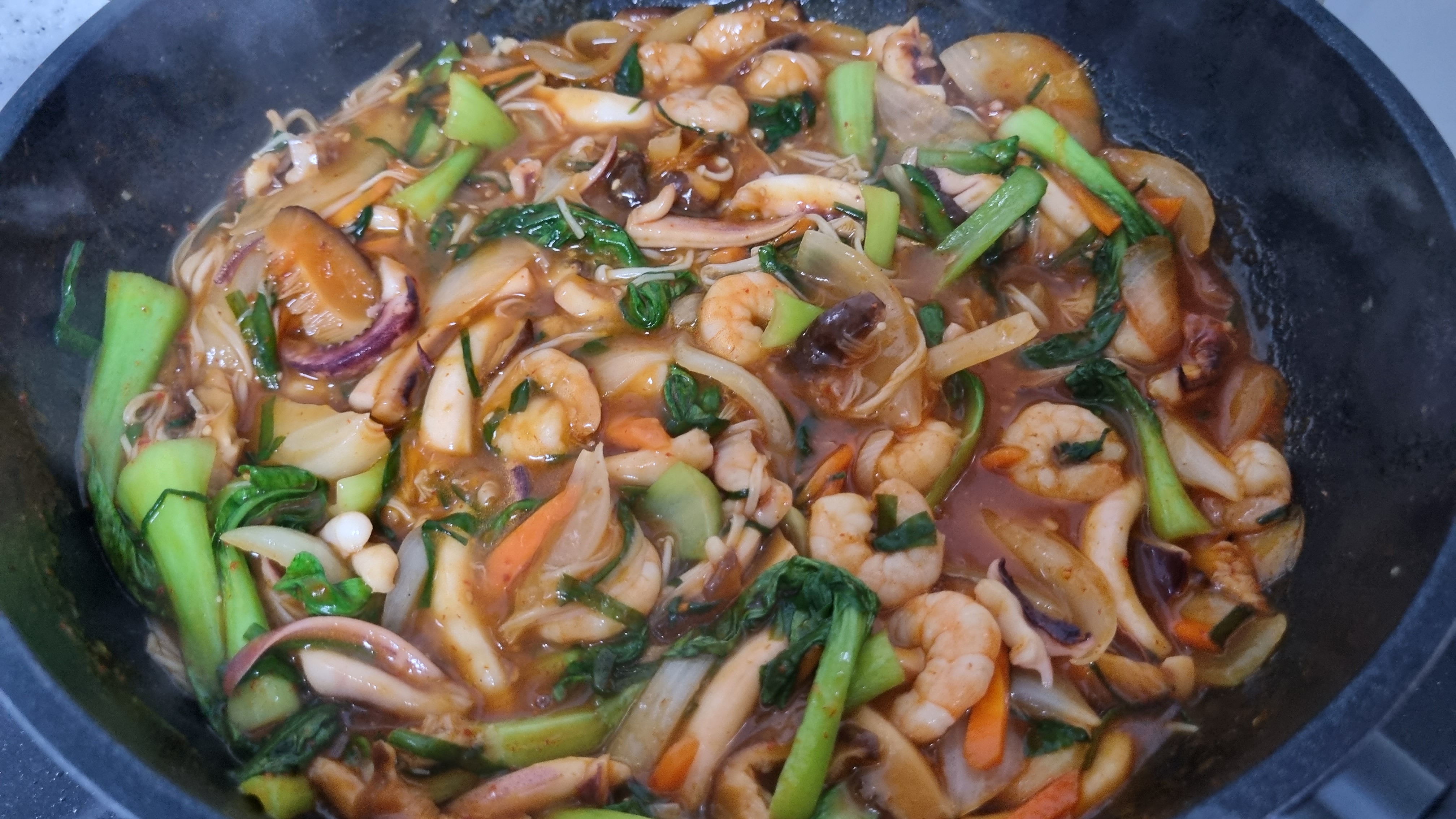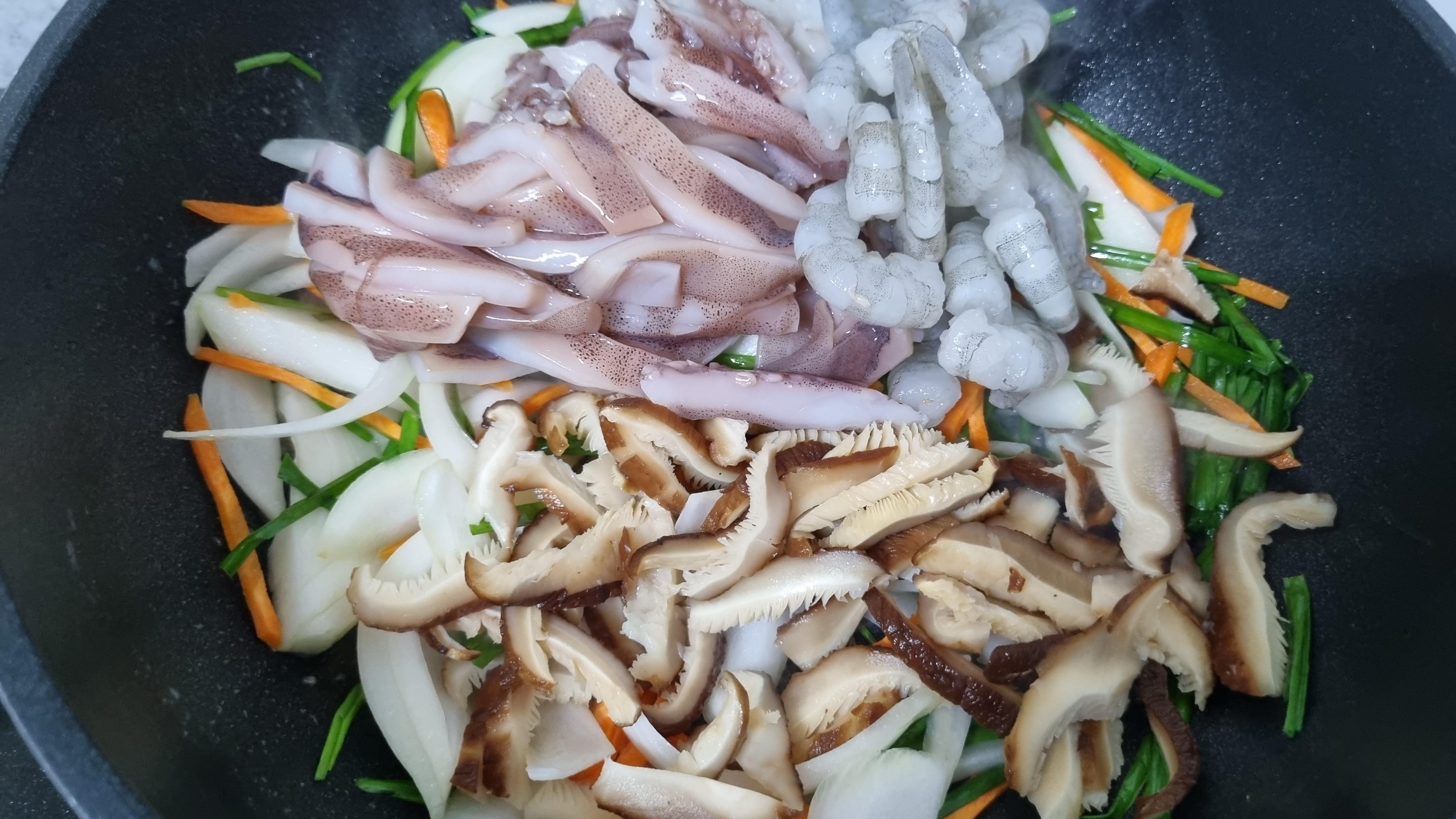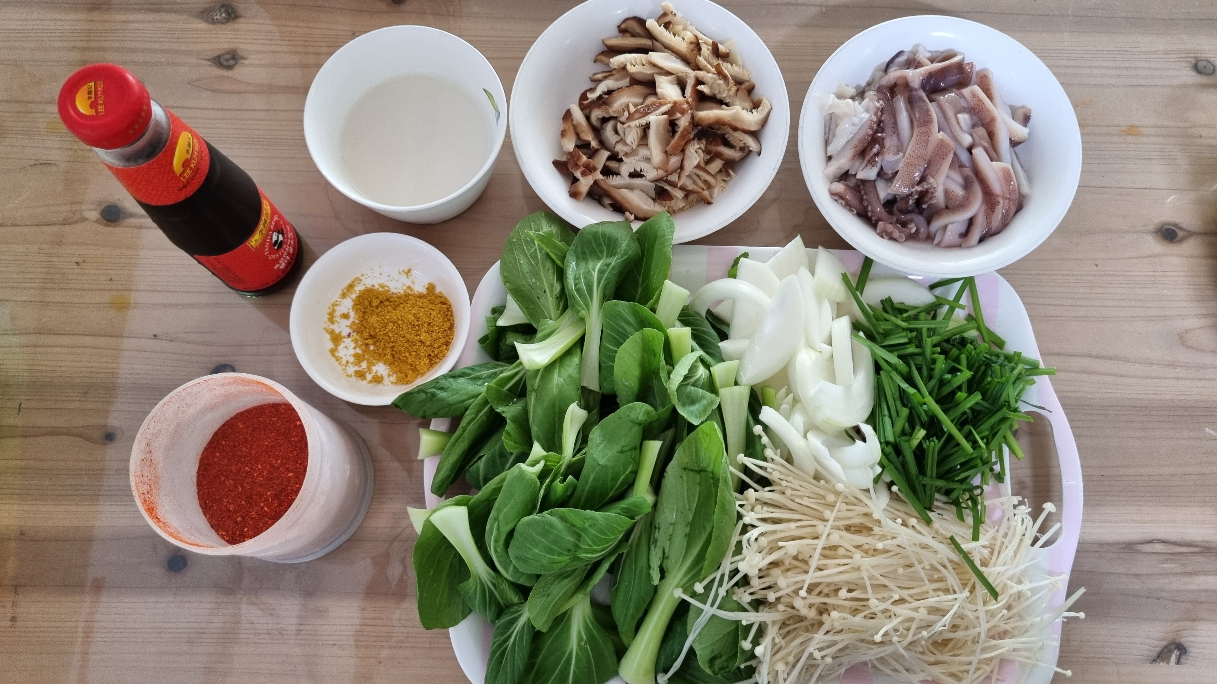 재료를 준비했다. 재료 준비부터 이미 유산슬 본래의 뜻을 파괴했다. 재료는 냉장고를 털어 넣을 수 있는 건 다 넣었다. 중국집 유산슬은 해삼, 죽순이 꼭 들어있다. 하지만 당장 해삼과 죽순을 구할 수가 없어서 생략했다. 표고버섯, 오징어, 새우, 청경채, 양파, 부추, 팽이버섯, 전분물, 카레가루, 고춧가루, 굴소스.