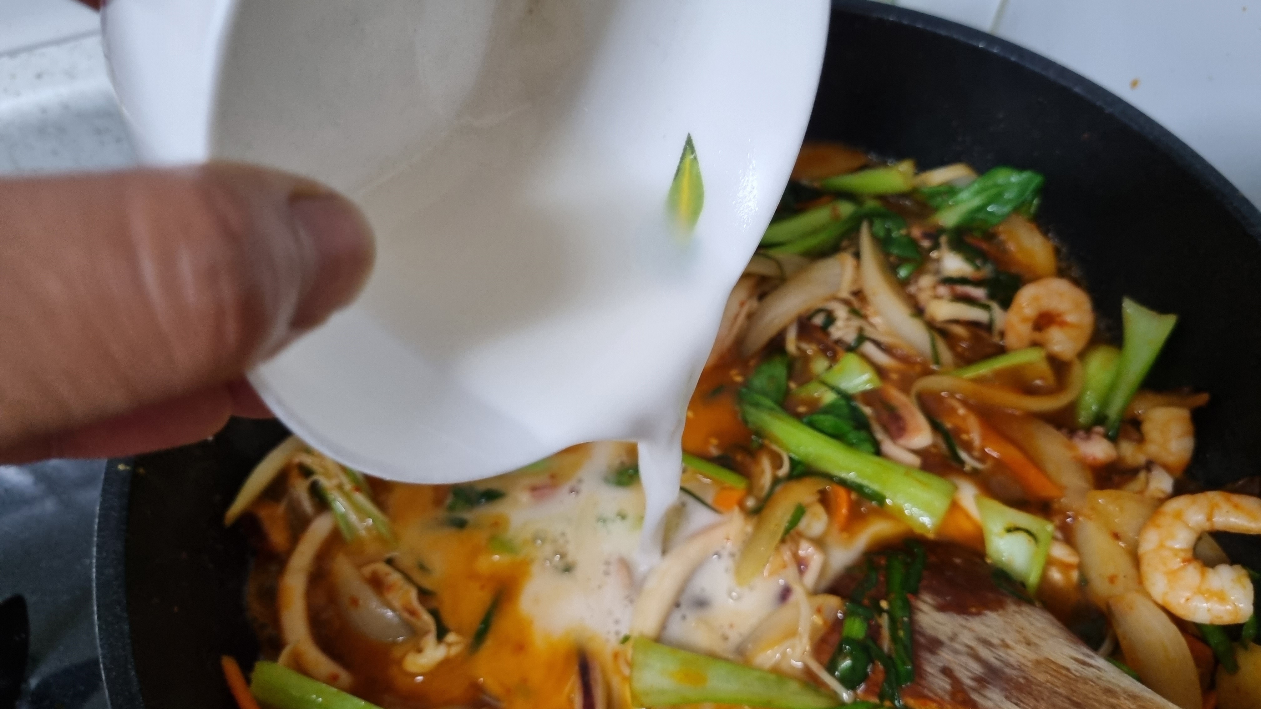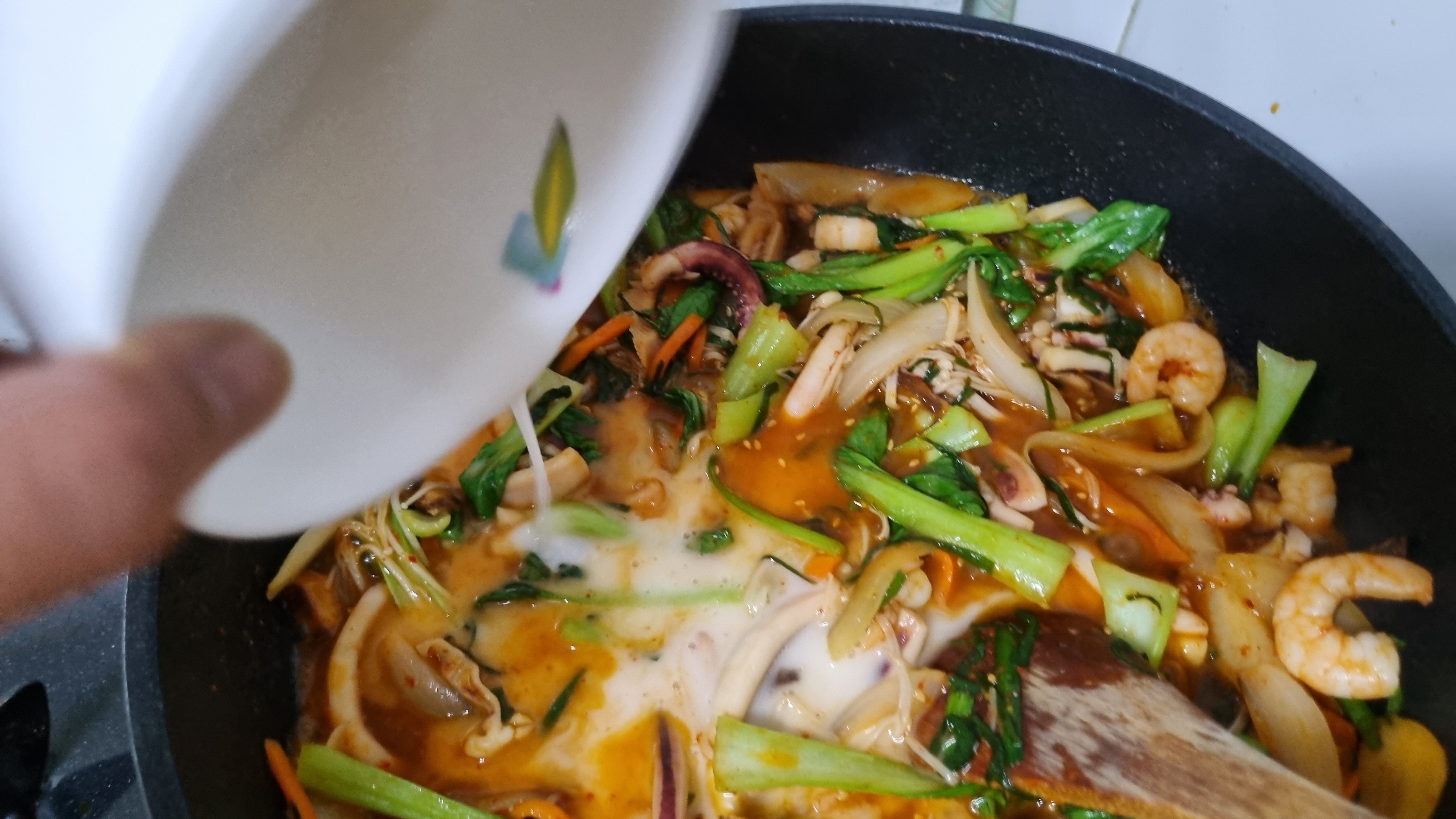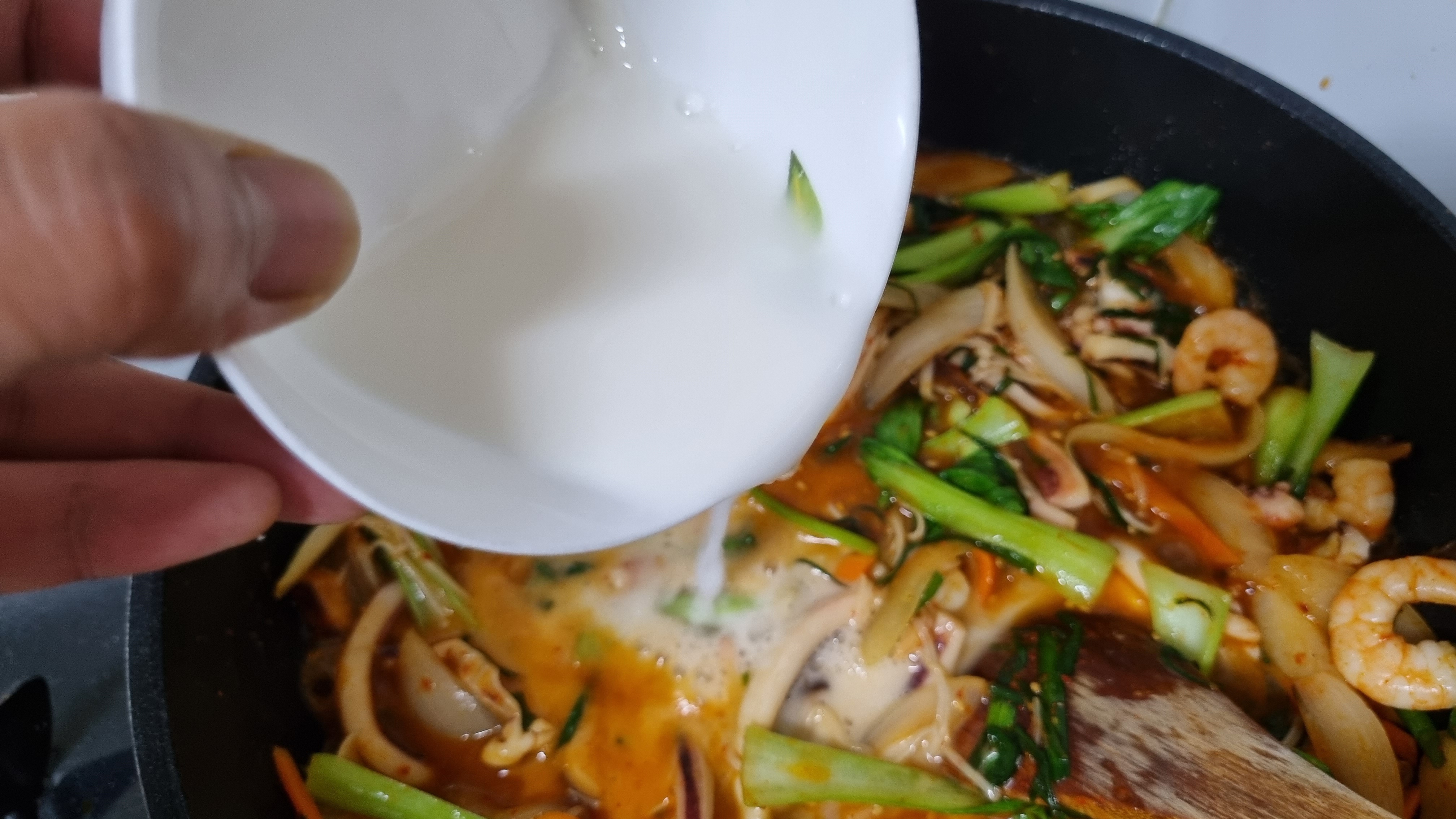 유산슬의 하이라이트!! 전분물을 넣어준다. 농도를 보면서 넣고 대충 적당히 걸쭉하면 불을 끈다.