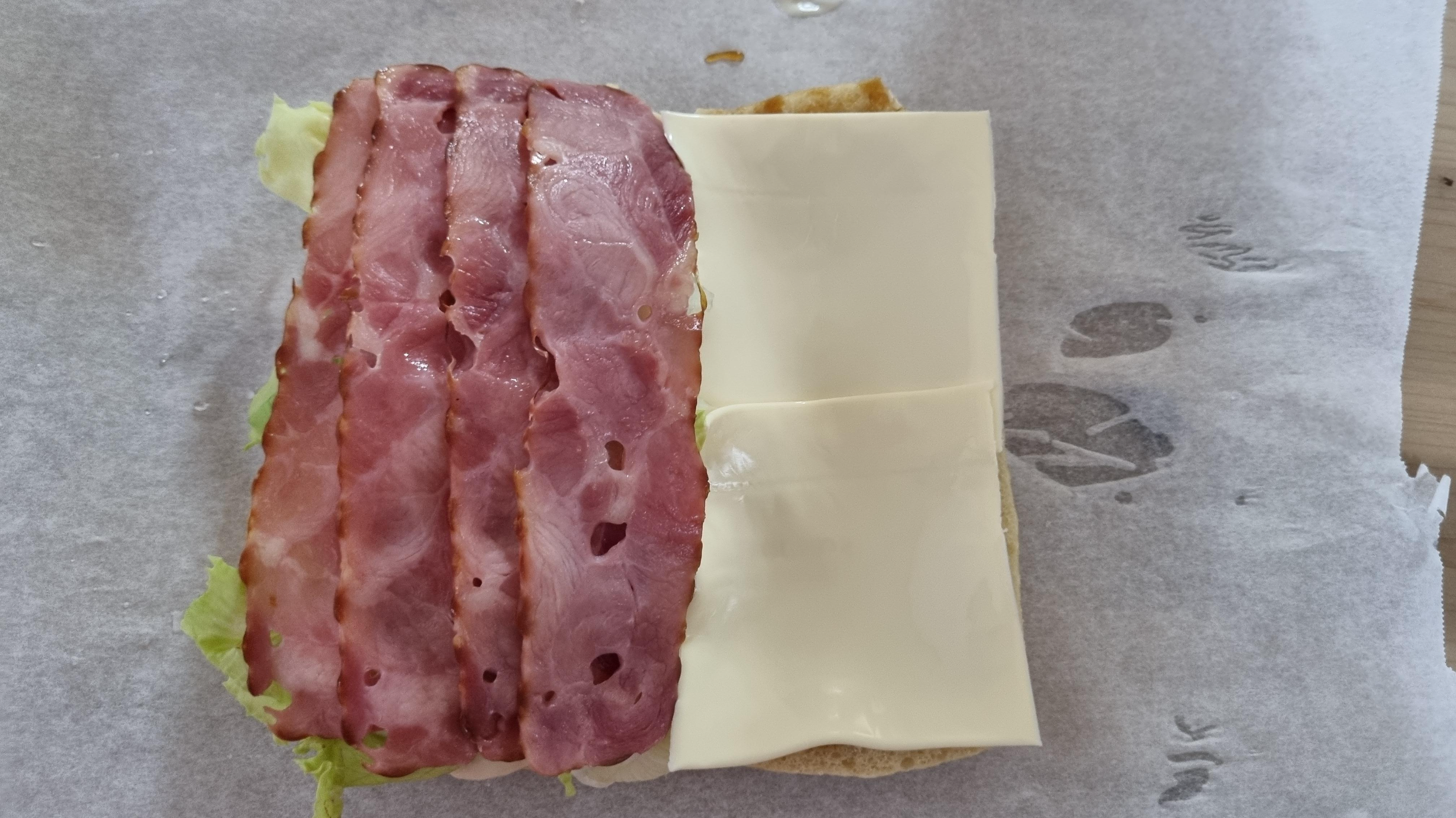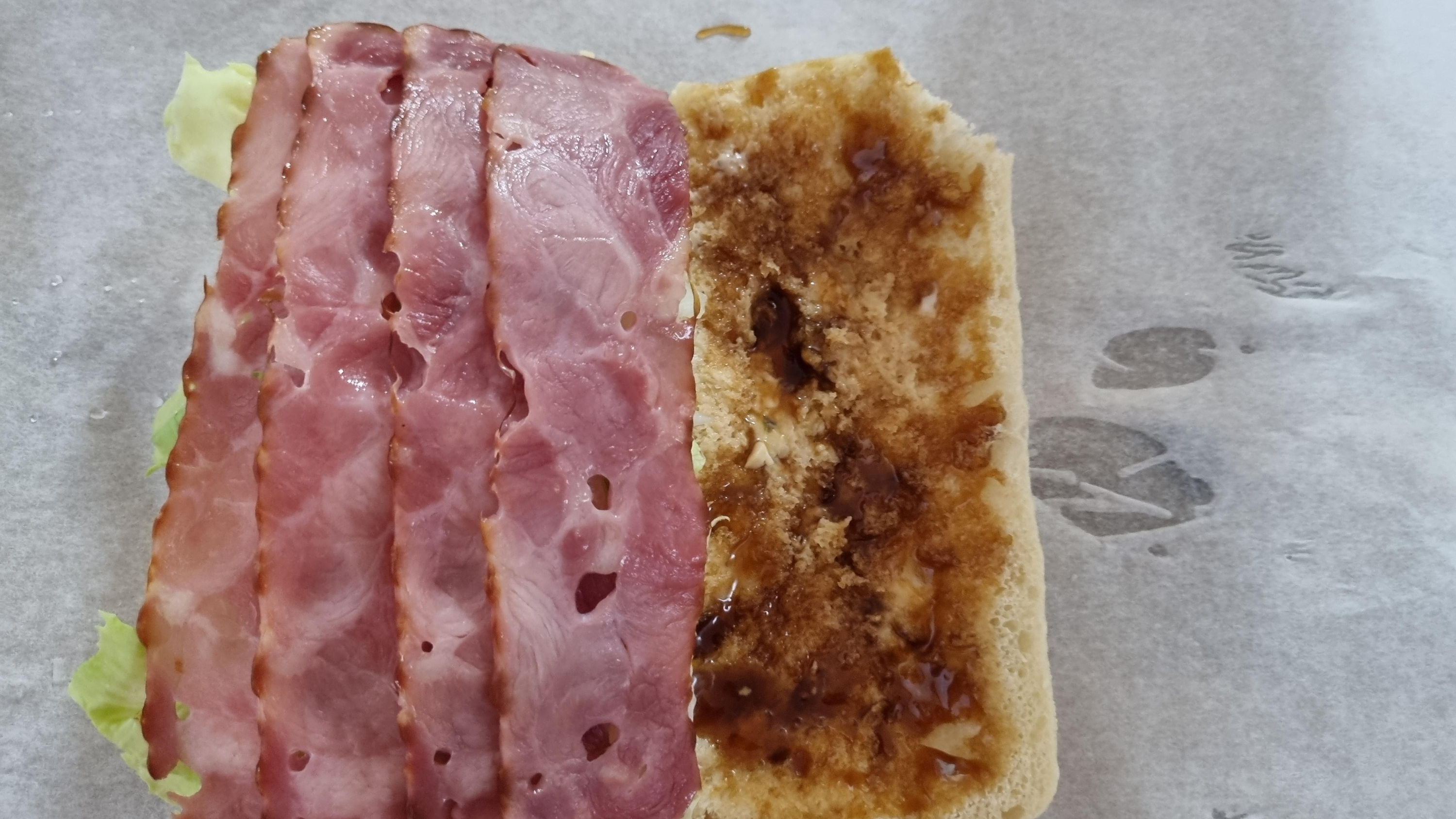 빵의 오른쪽에 데리야끼 소스를 발랐다. 저 데리야끼 소스는 달고 맛있다. 햄버거에도 잘 어울리지만 샌드위치와도 잘 어울린다.
