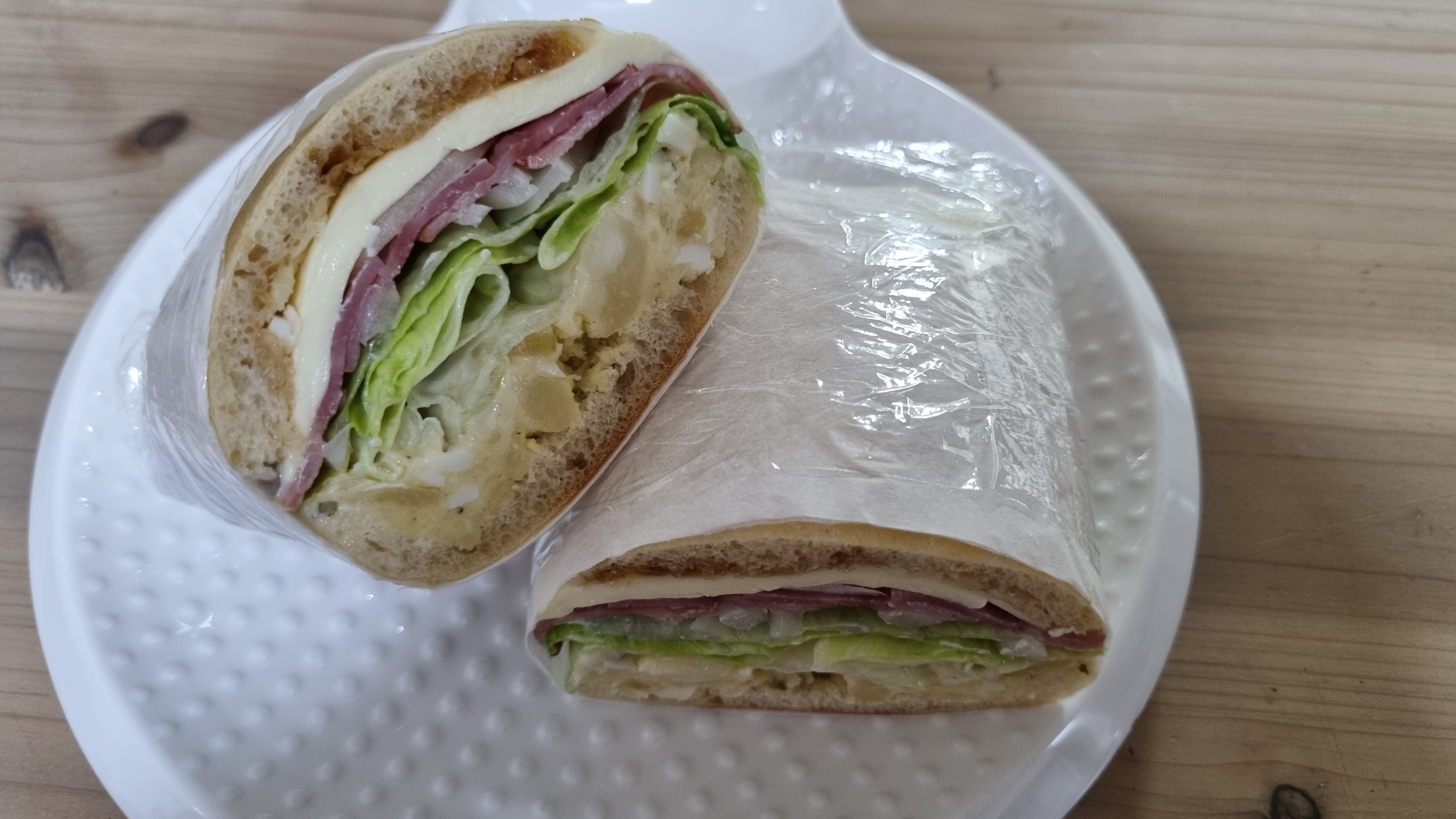 잘 덮어서 종이호일로 감고 랩을 씌웠다. 이러면 샌드위치 모양이 망가지지 않게 반으로 가르기 쉽다.