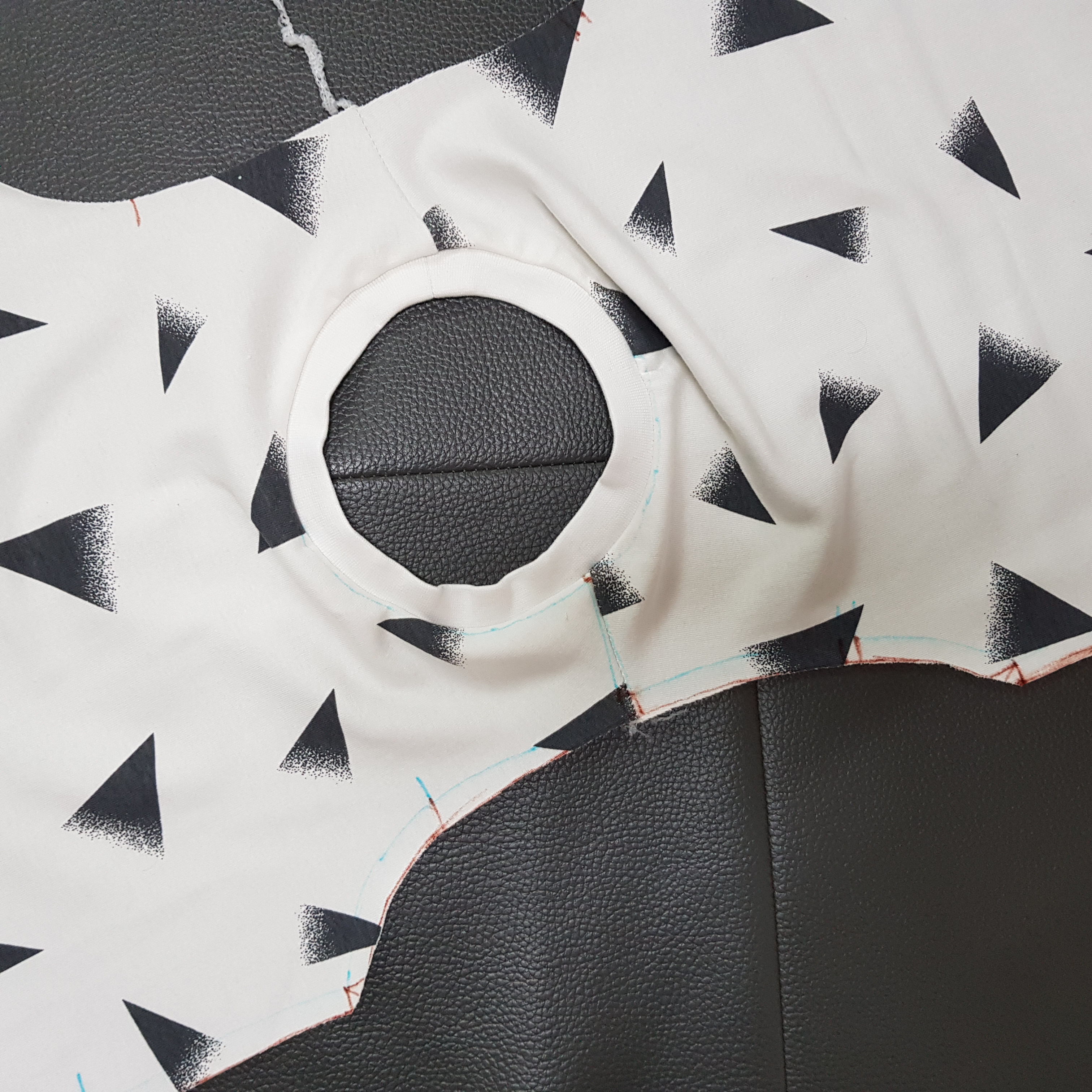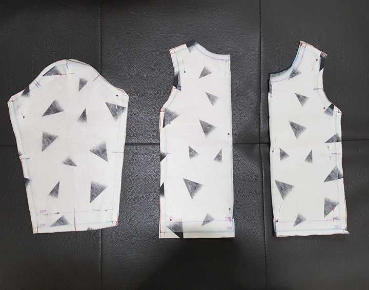 시접을 그리고 아래 사진과 같이 원단을 재단했다. 에휴~ 아무래도 겨드랑이 끝부분이 이상하다. 시접 분량은 다시 알아봐야 될 것 같다.