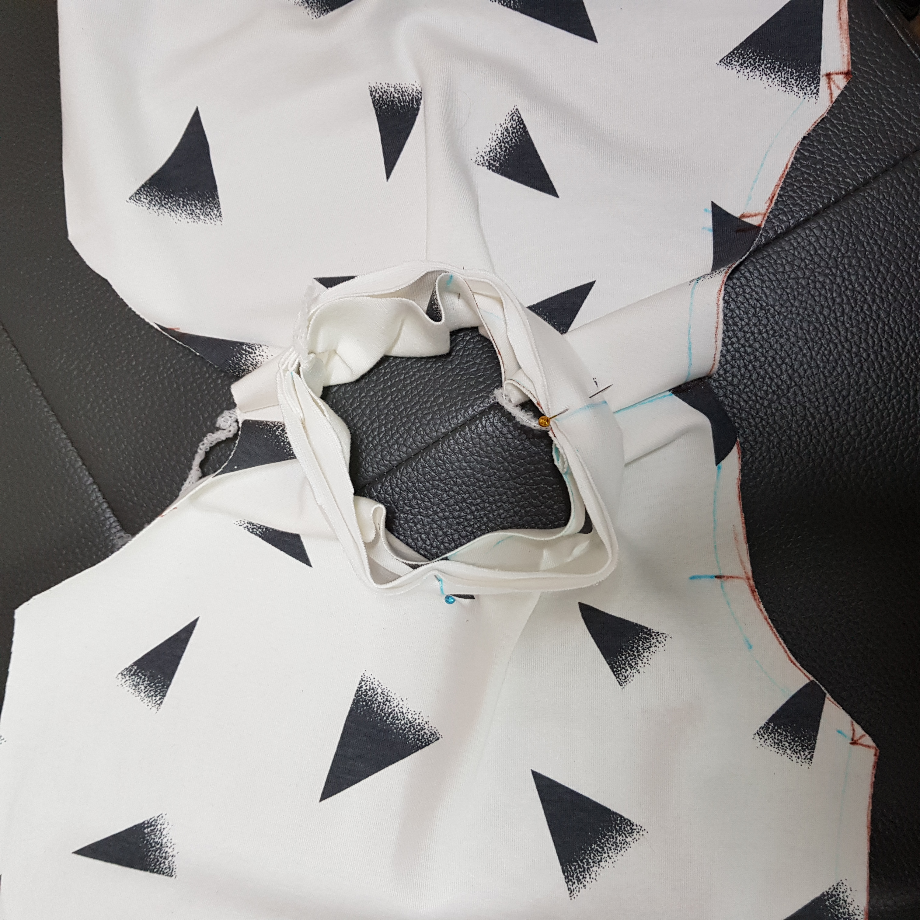 어깨선을 재봉하고 목 시보리를 시침핀으로 고정했다. 시보리를 시침핀으로 고정하기 전 목 전체 둘레는 42cm였고 80%의 길이인 34cm로 시보리를 만들었다. 앞둘레는 20cm, 뒤둘레는 14cm이다. 비례식을 이용해 4등분 했다.
