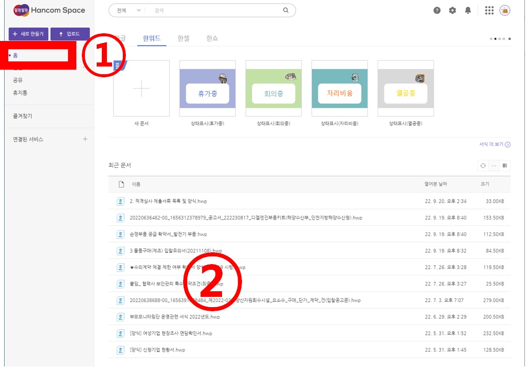 문서가 잘 저장되었는지 확인하기 위해 최근 문서에서 원하는 문서를 클릭한다. (마우스 왼쪽 버튼)