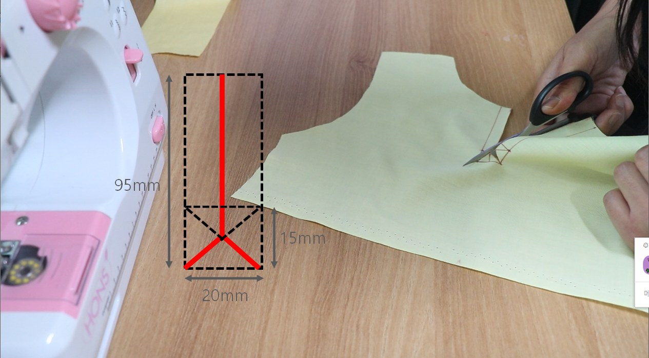 그린다. 95x20(mm)이다. 길이 95mm 중 15mm는 원단을 겹쳐 박음질 할 부분이다. 폭은 20mm이다. 성인의 경우 보통 110x30(mm)으로 만드는데 아동용이라 좀 작다.