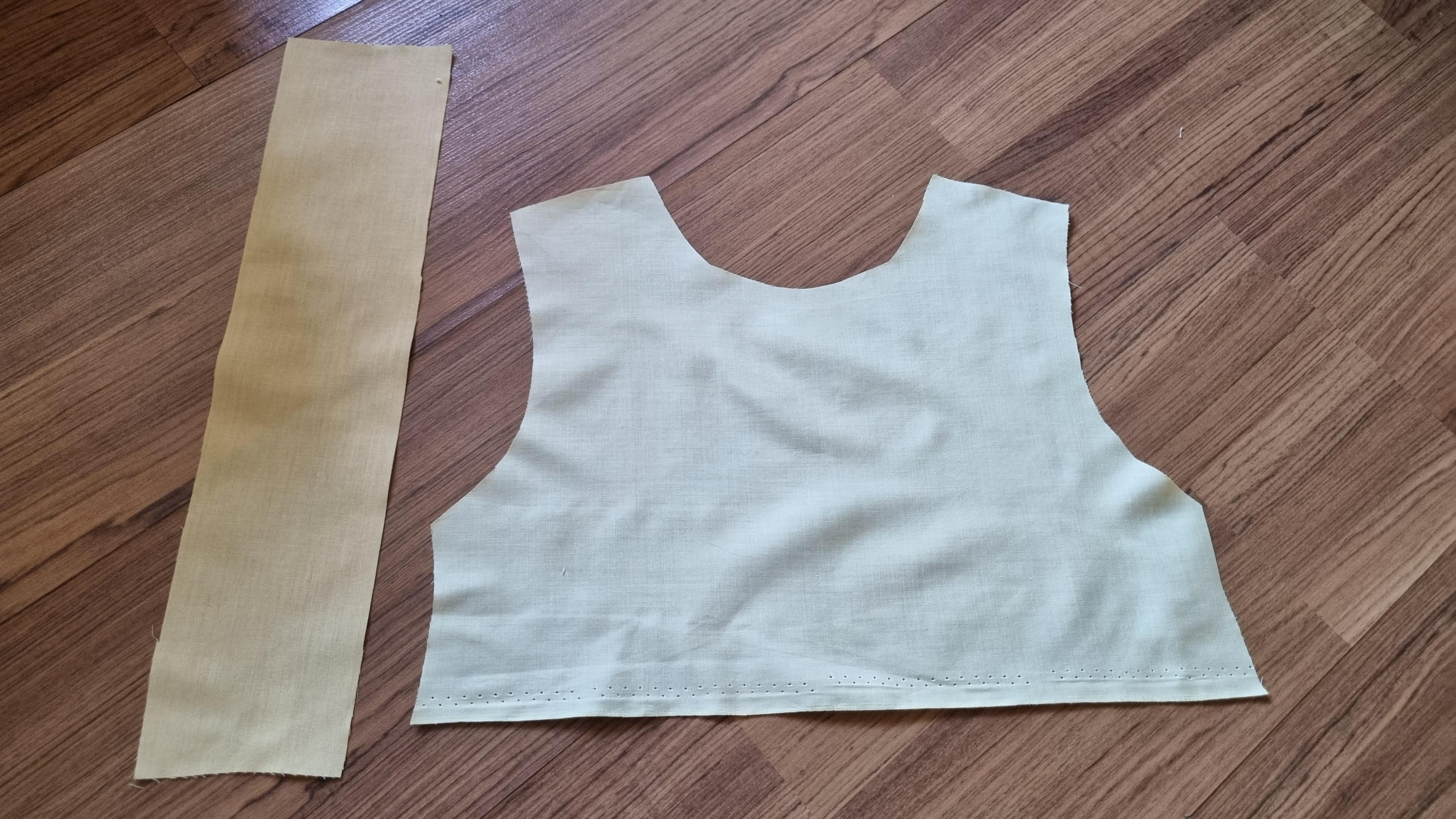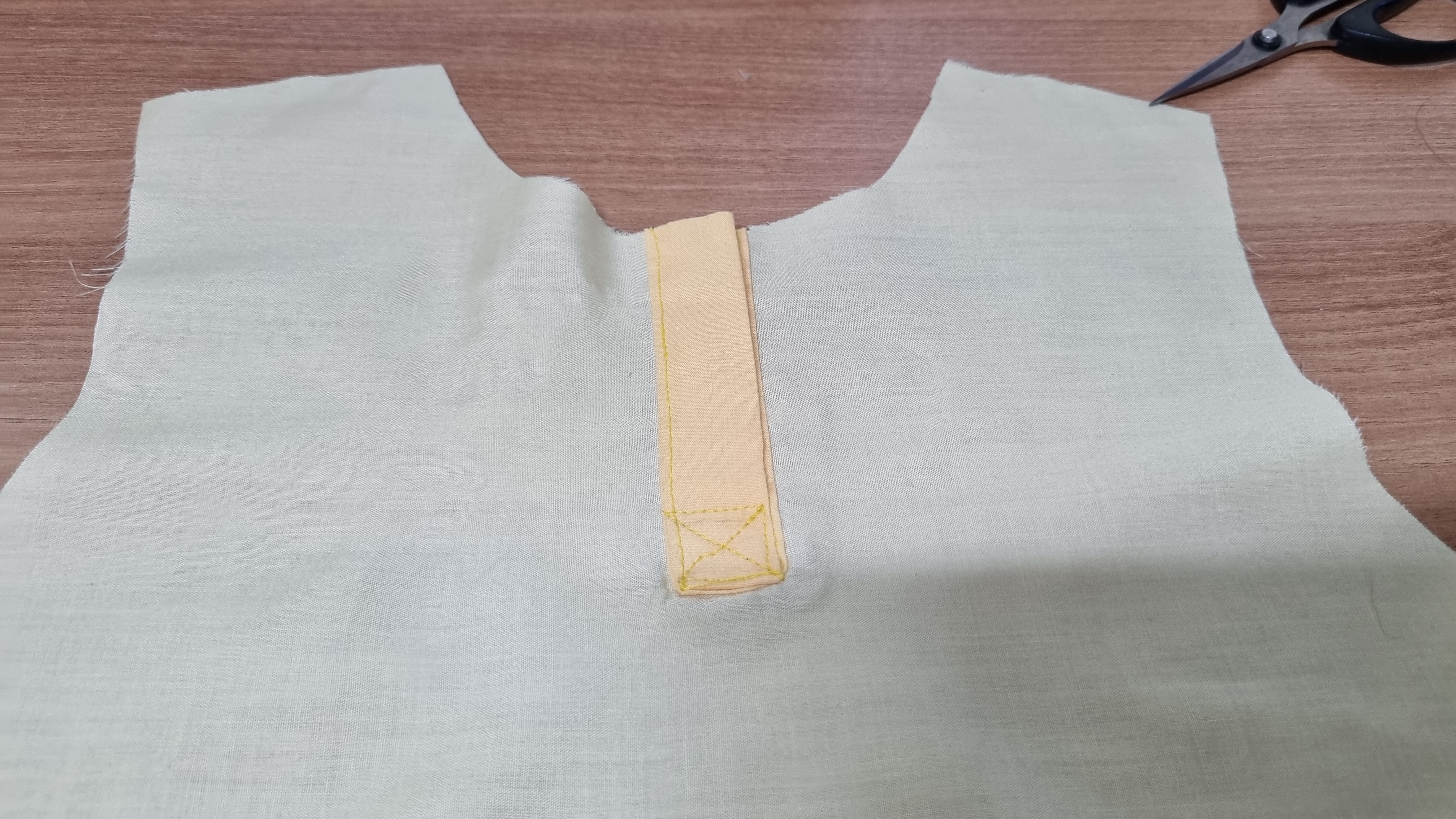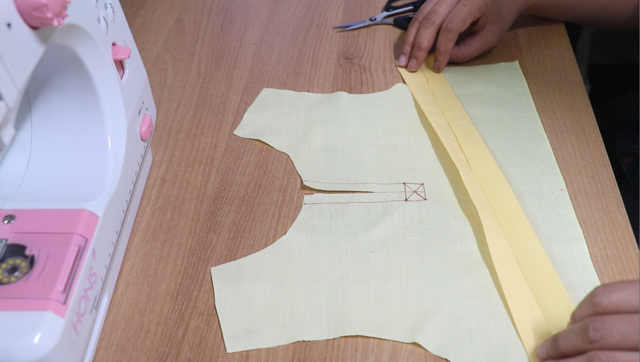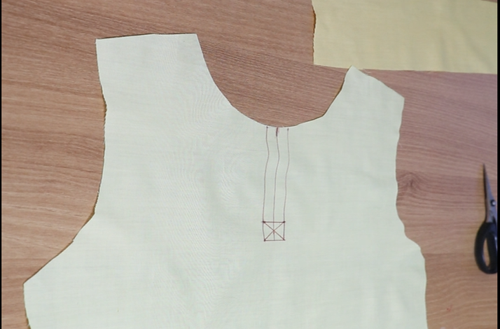 아동 원피서의 앞트임을 쉽게 만들기 위해 원피스 앞판과 플래킷으로 사용할 원단 하나를 준비한다.