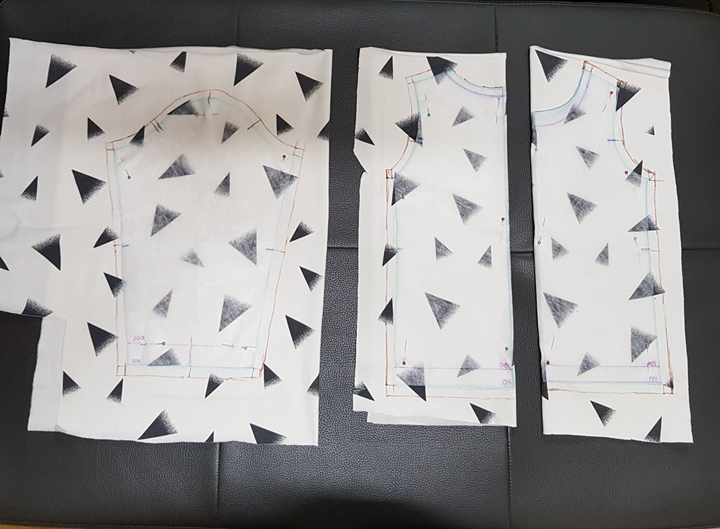 시접을 그리고 아래 사진과 같이 원단을 재단했다. 에휴~ 아무래도 겨드랑이 끝부분이 이상하다. 시접 분량은 다시 알아봐야 될 것 같다.