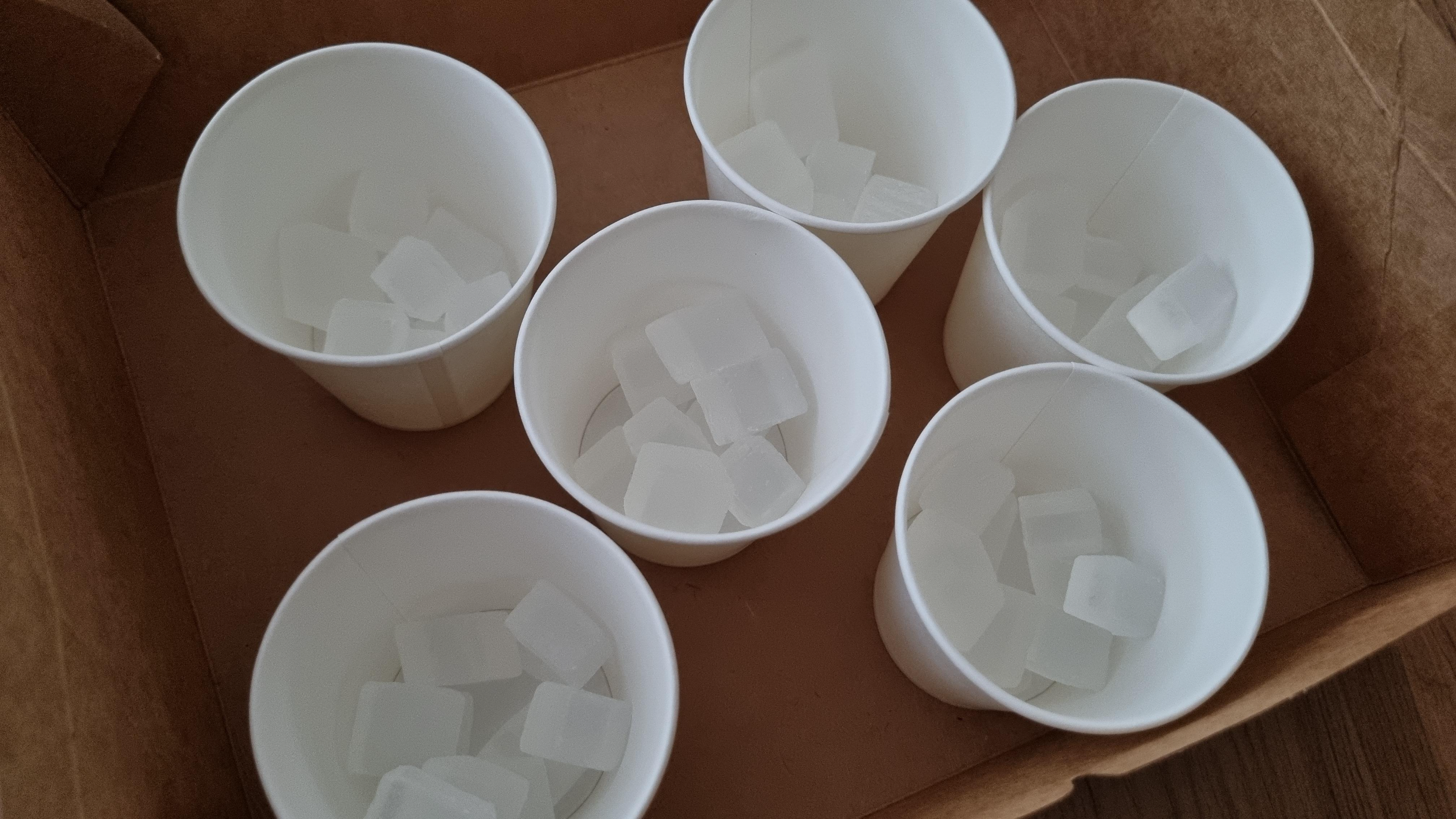 비누 베이스를 종이컵에 50g씩 담았다. 정확히 50g을 맞출 수 없어서 대충 깍두기 모양 10개 정도를 종이컵에 담았다.