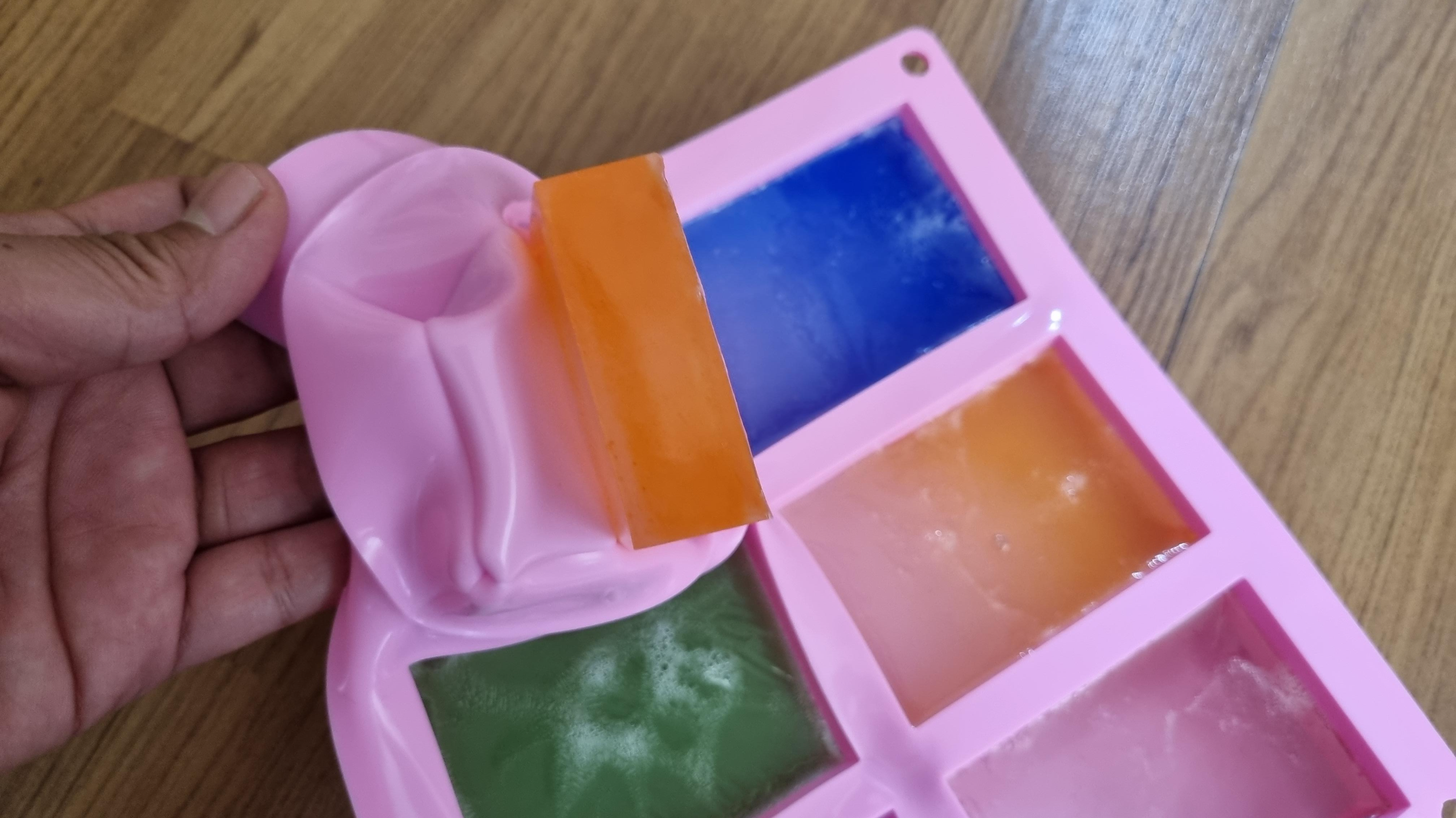 1시간 정도가 지나고 비누 몰드에서 비누를 꺼냈다. 비누 몰드가 실리콘 재질이라서 생각보다 비누를 꺼내기 쉬웠다. 투톤 그라데이션이라 예쁘다. 다음에 또 투톤으로 비누를 만들어야지!!