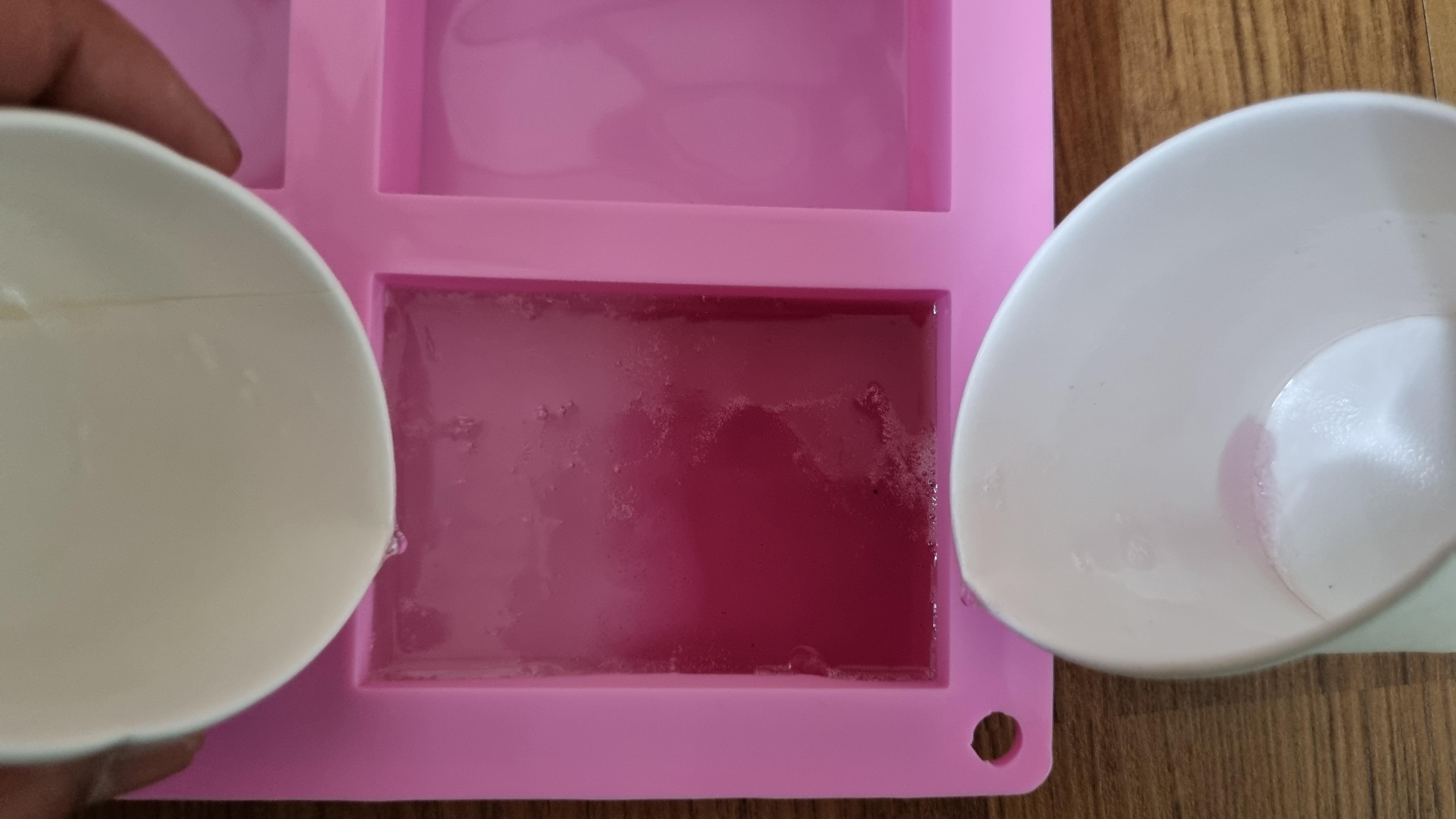 비누 몰드에 투명한 비누 베이스 액체와 핑크색이 된 비누 베이스 액체를 양쪽에서 넣었다. 그래야 그라데이션 비누를 만들 수 있다.