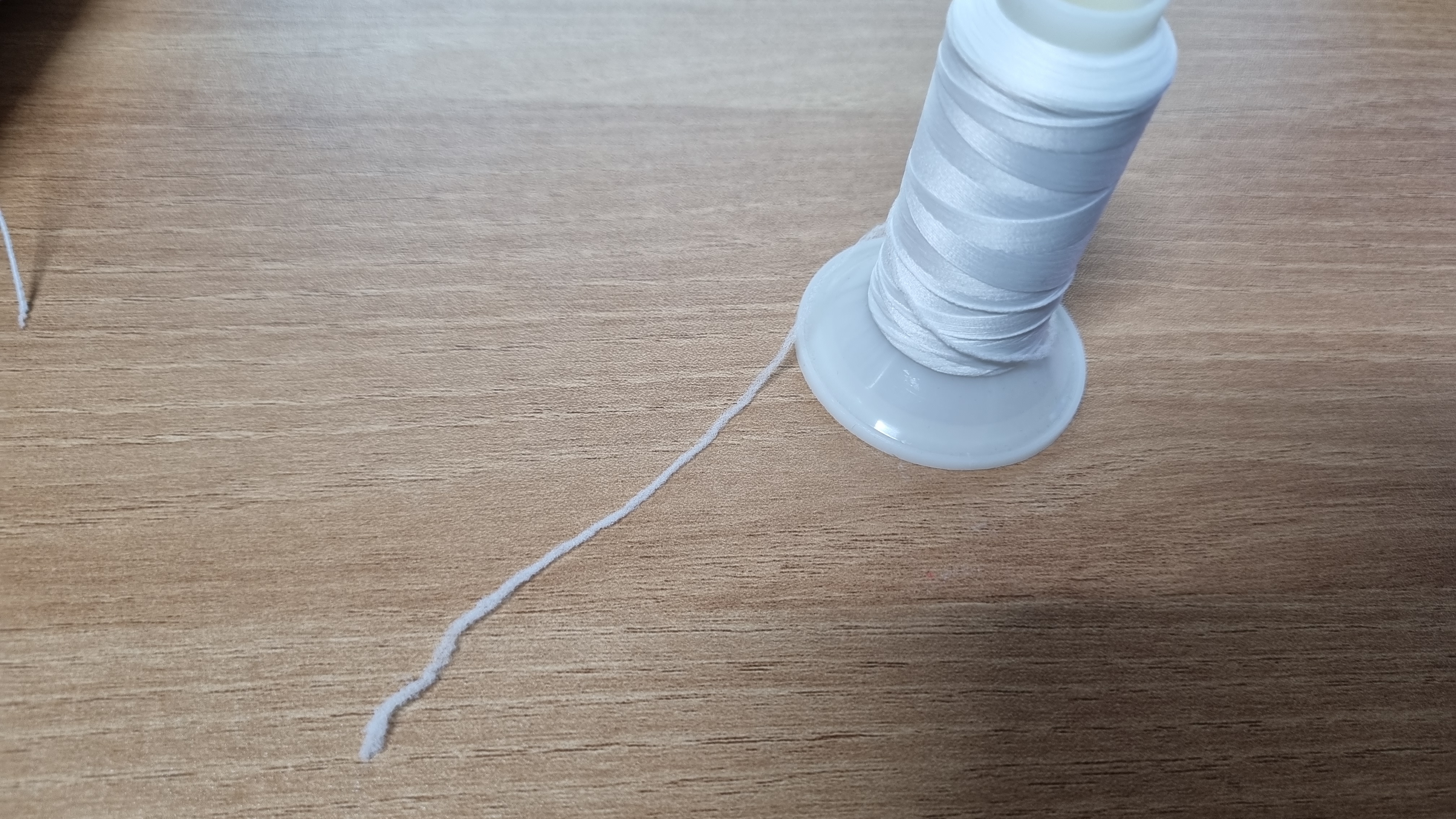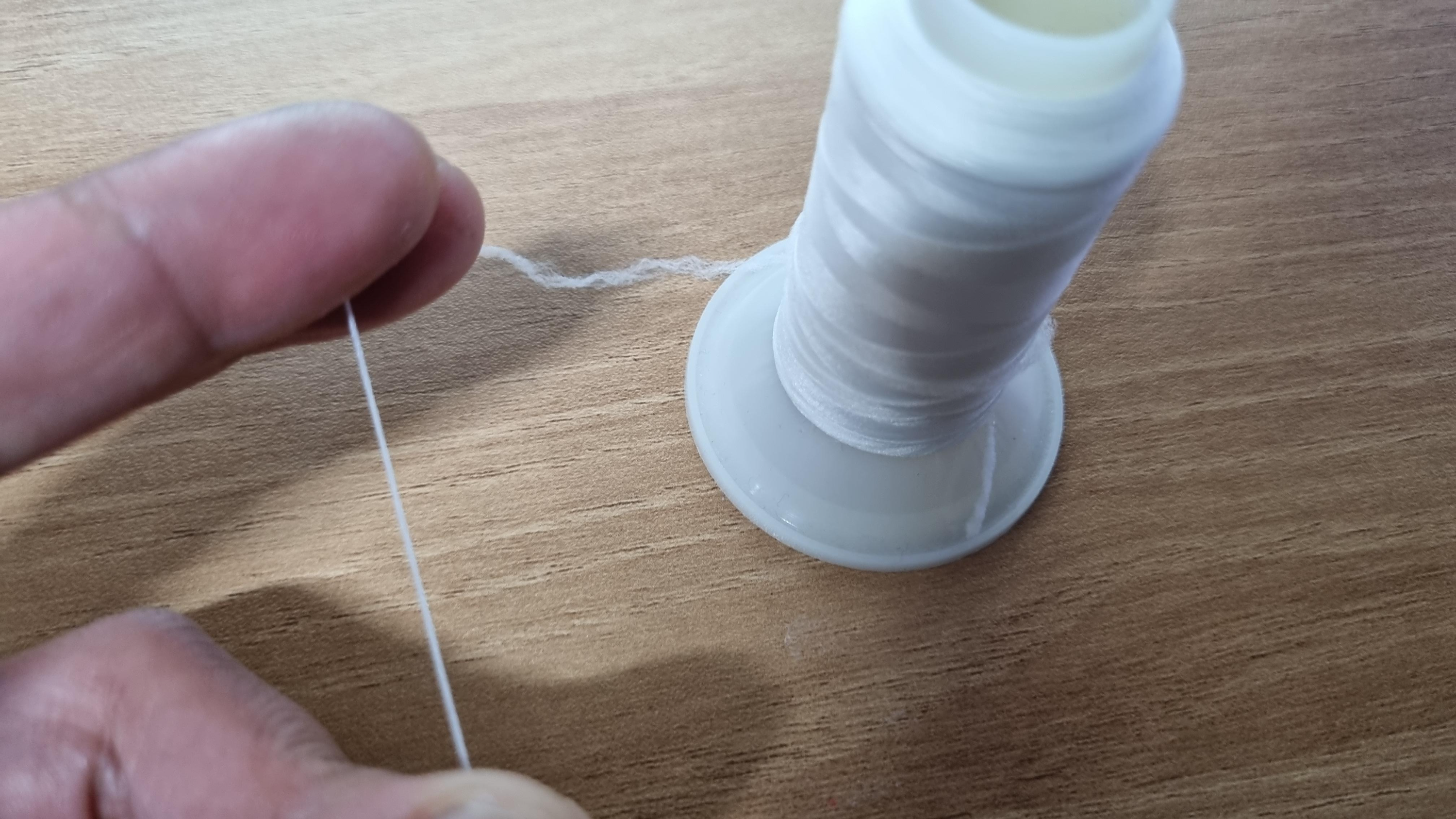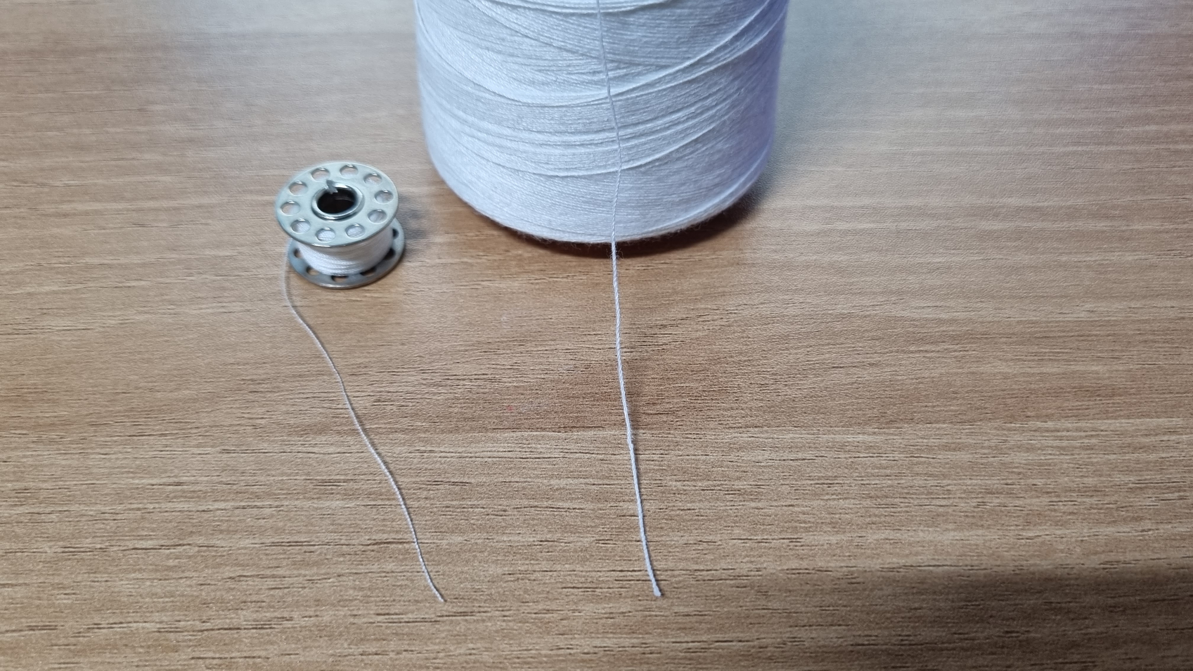 왼쪽의 실은 일반 면실, 오른쪽의 실은 굵은 청바지 실이다. 이렇게 실의 굵기가 심할 경우도 약한 실이 끊어진다. 아마도 특수한 경우가 아니라면 이렇게 실의 굵기가 다른 실을 사용하는 경우는 없을 것이라 생각한다. 필자처럼 밑실 감기 귀찮아서 아무거나 보빈에 감긴 거 넣으면 밑실이 끊어진다. 이 사실도 오랜 경험을 통해서 깨달았다. 미싱 독학 쉽지 않다.