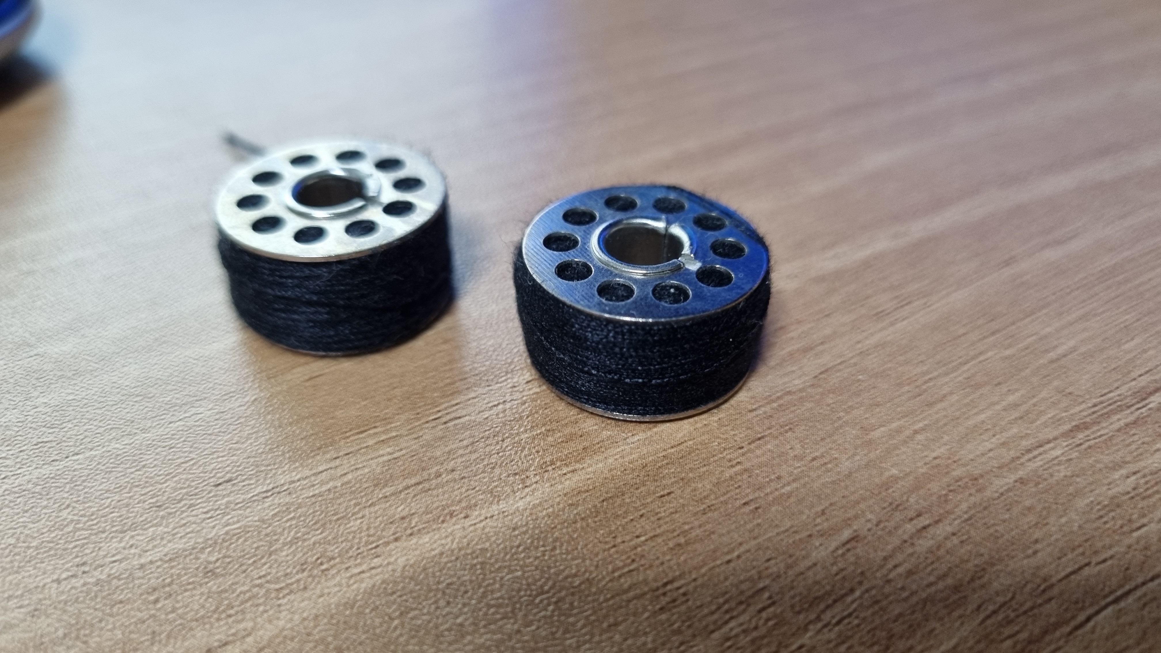 위의 사진을 보면 두개의 보빈에 감겨있는 실의 양이 다르다. 왼쪽의 보빈은 적당히 잘 감겼다. 하지만 오른쪽의 보빈에 감긴 실의 양을 보면 굉장히 많아 보인다. 이런 경우 밑실이 엉키면서 실이 끊어지는 경우도 있고 실이 엉켜서 엉킨 실을 잘라내고 빼느라 엄청 고생하는 경우도 있다. 온갖 핀셋을 동원하며 힘으로 잡아 뜯고 자르고 진땀을 빼는 경우가 종종 있었다. 원인은 밑실 감기 귀찮아서 한 번에 잔뜩 감아서 써더니 낭패를 피하지 못했다.