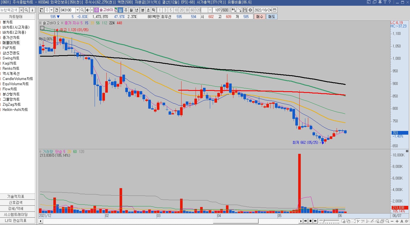 동전주고, 바이오 주라서 좀 꺼려지긴 하지만 주가가 장기 이평선 사이에 있어서 연습하기 좋은 거 같아요.