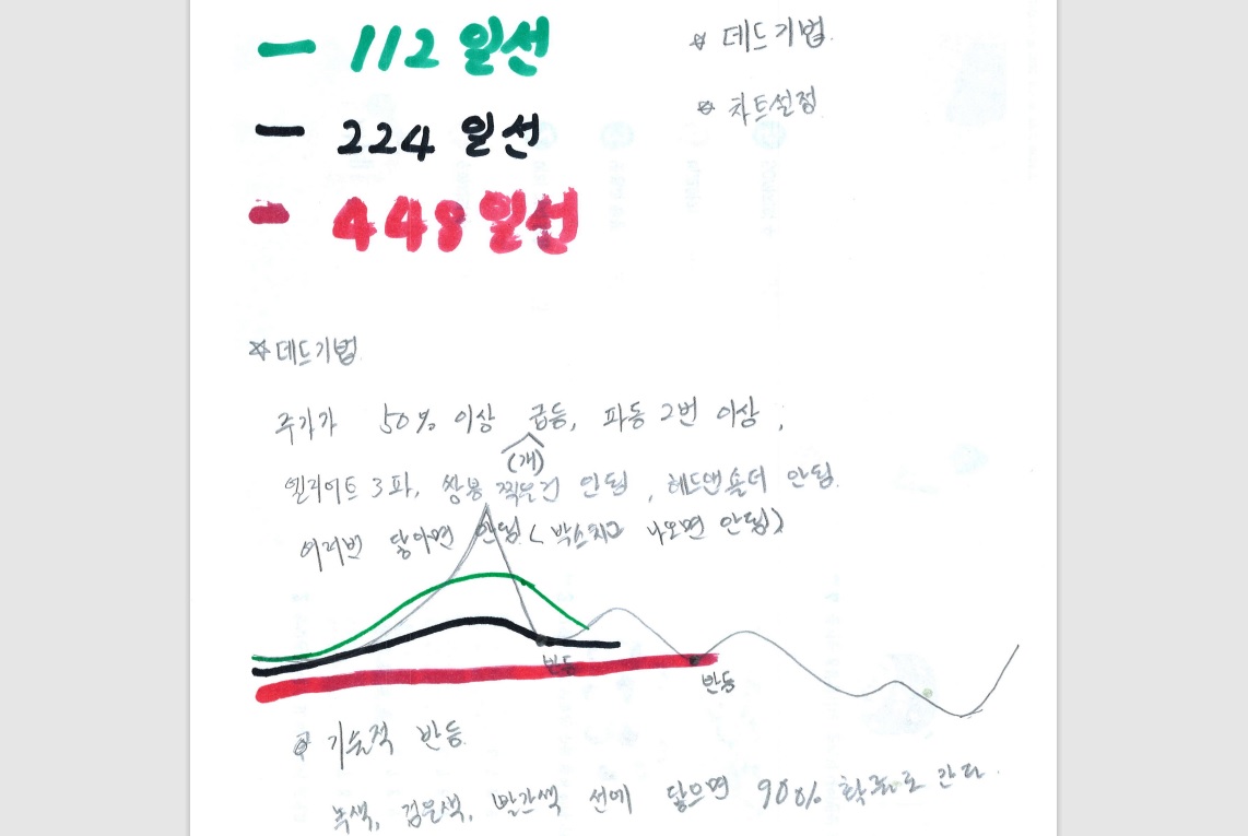 녹색(112일선), 검은색(224일선), 빨간색(448일선)에 닿으면 90% 확률로 반등한대요.