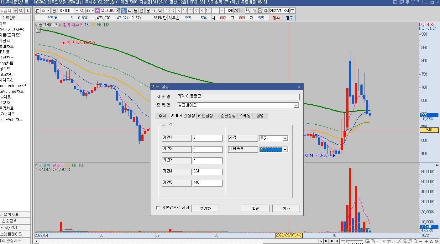 가격을 종가, 이평 종류를 지수로 바꿔요.