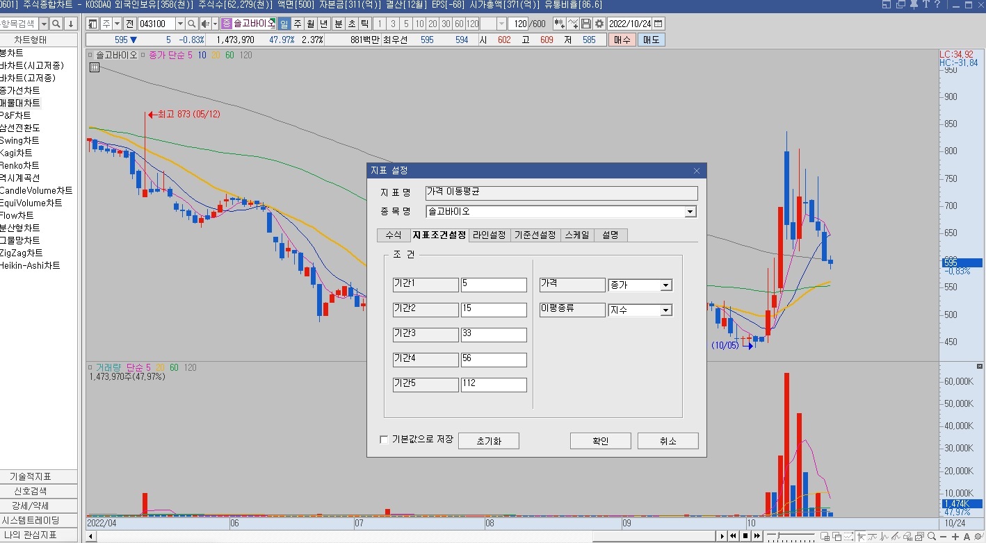 지표 조건 설정 탭에서 기간을 5, 15, 33, 56, 112로 바꿔요.