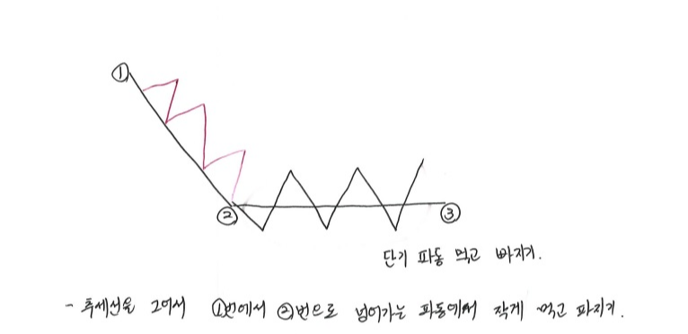 1번 구간에서 추세선을 그어서 1번에서 2번으로 넘어가는 단기 파동에서 적게 먹고 빠지는 방법도 있대요.