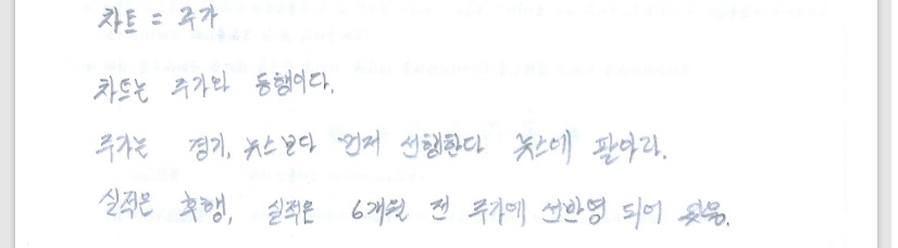 차트가 곧 주가예요. 차트는 주가와 동행이에요. 주가는 경기와 뉴스보다 먼저 선행한다고 해요. 뉴스에 팔으라는 말이 괜히 나온 말이 아니에요. 차트는 항상 선행한다는 얘기예요. 주가는 실적 발표보다 6개월 전에 선반영 된다고 했어요. 그래서 실적 좋다고  무작정 투자하면 안 된다고 했어요.