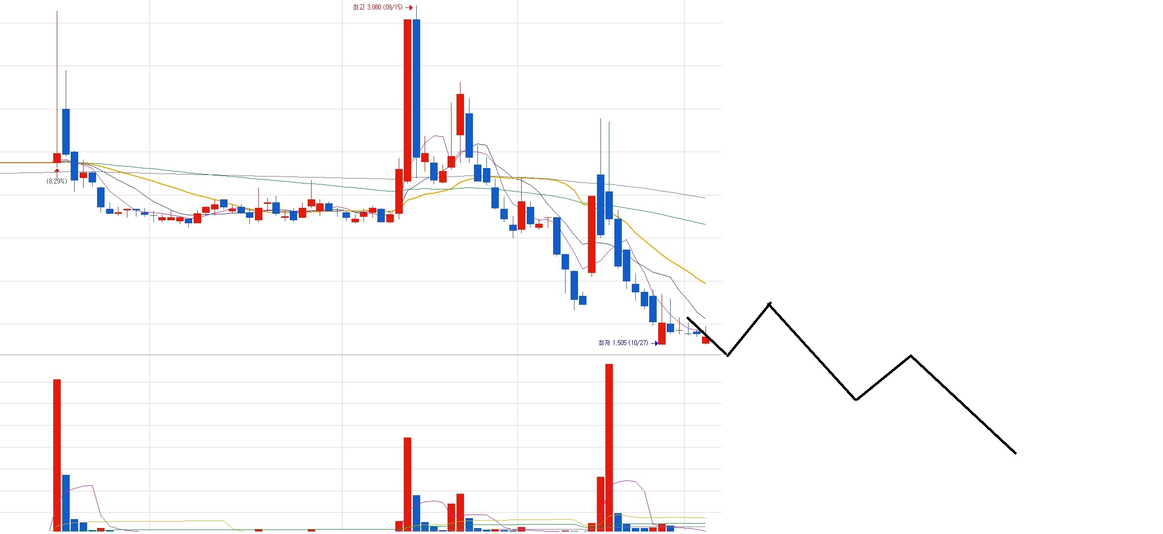 이런 차트가 하락 매집이래요. 그냥 계속 흘러내리는 거예요. 오른쪽 검은색 선은 주가의 예상 경로예요.