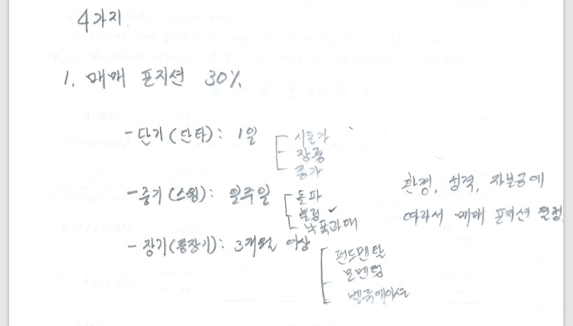 매매 포지션은 주식에서 수익을 내기 위해 비중 30%나 차지하는 아주 중요한 부분이에요. 매매 포지션이 무엇이냐면 단기(단타), 중기(스윙), 장기(중장기)를 말해요. 본인에게 맞는 매매 포지션을 갖고 매매를 해야 깡통 되지 않는다고 했어요.