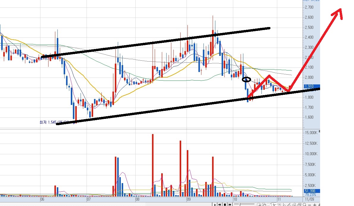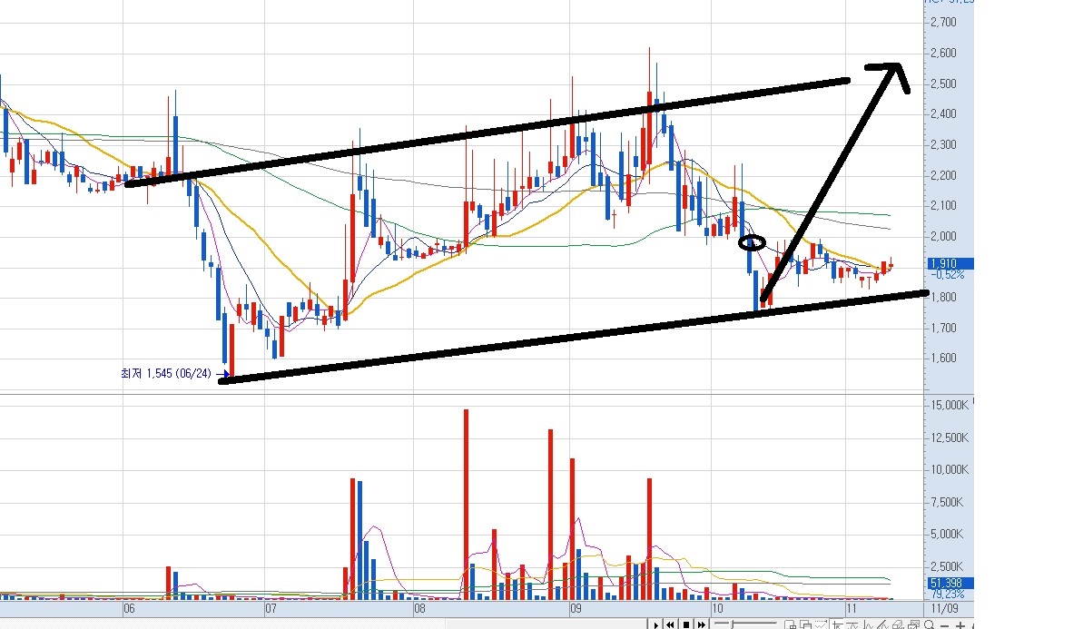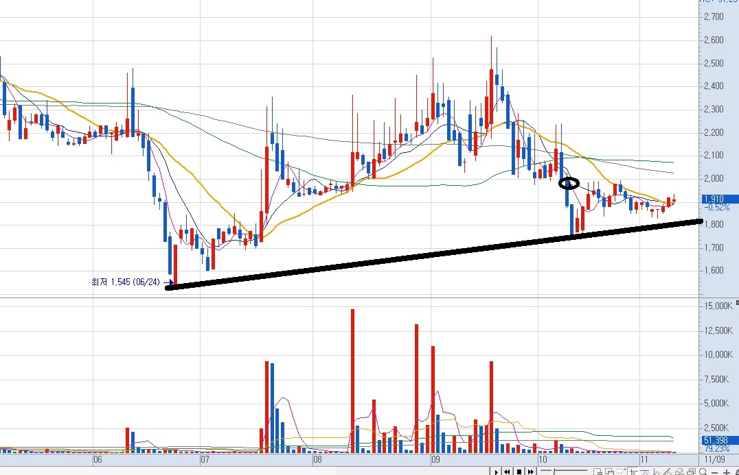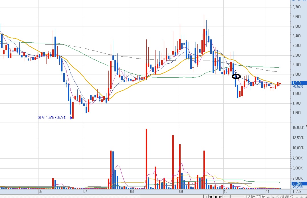 위의 차트를 검은색 동그라미를 볼 수 있어요. 저 검은색 동그라미 부분이 필자의 매수 타점이에요. 1,910원 부근에서 매수를 했어요. 그리고 주가가 계속 하락해요. 하지만 손절하지 않았어요.