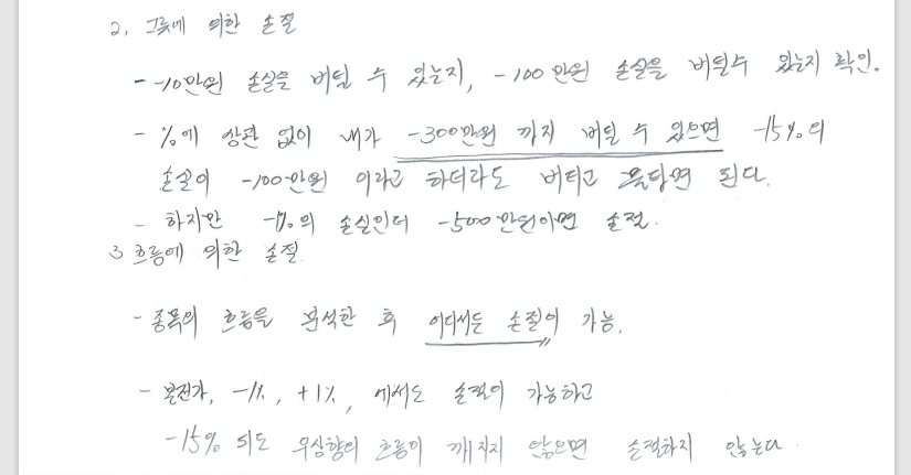 그릇에 의한 손절은 10만 원 손실을 버틸 수 있는지, 100만 원 손실을 벌틸 수 있는지 확인하는 거예요. 마이너스 몇 %에 상관없이 내가-300만 원 까지 버틸 수 있으면 -15%의 손실이 100만 원이라고 하더라도 버티고 물 타면 된대요. 하지만 -1%의 손실이 500만 원이라면 당장 손절해야 된대요.