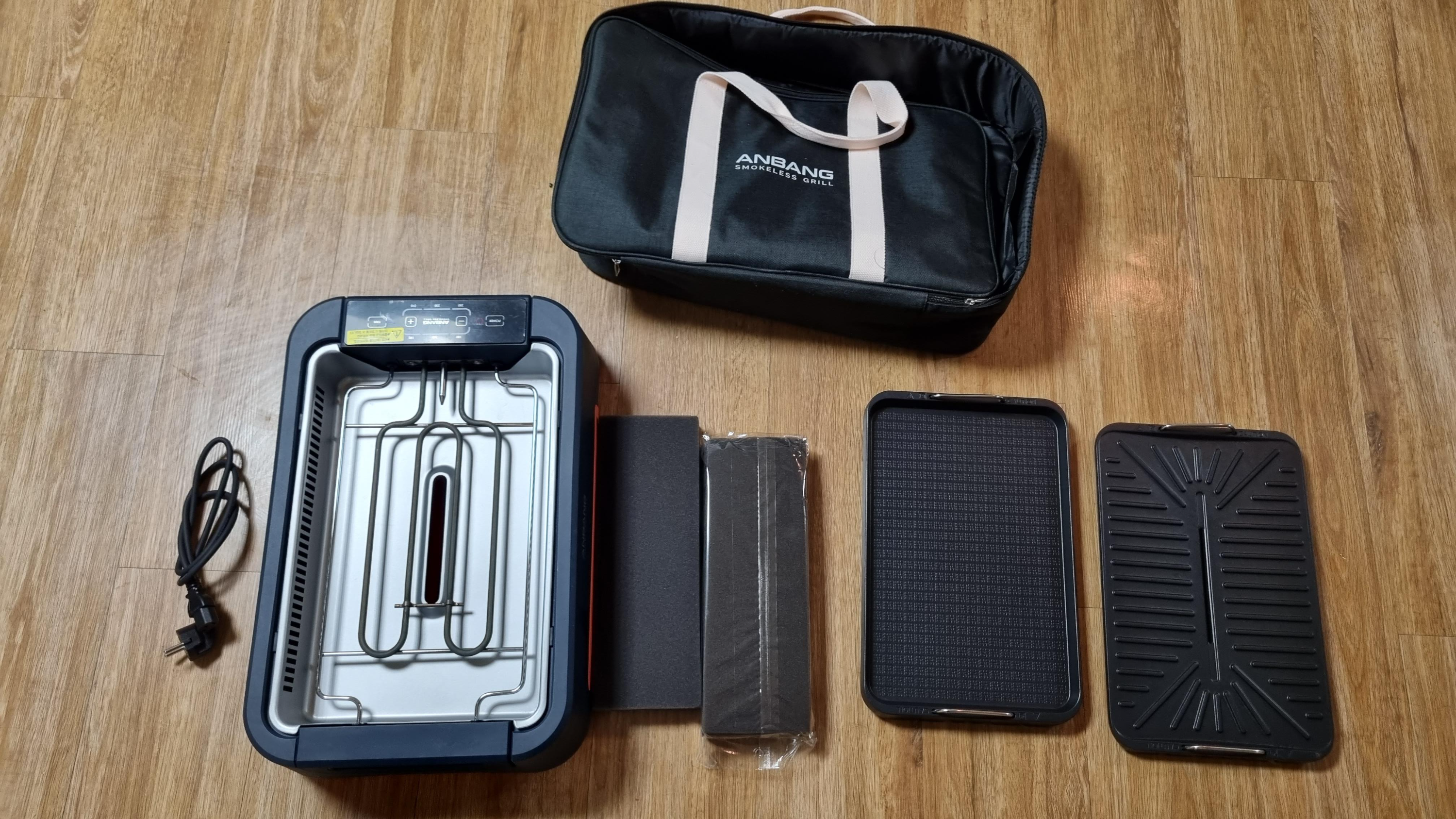 구성품은 크게 복잡하지 않아요. 전원선, 본체, 필터, 볶음팬, 그릴팬, 가방이 전부예요.