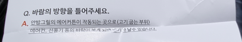 안방그릴의 가장 큰 장점은 고기 굽는 연기가 나지 않는 거에요. 고기의 기름이 공기중으로 날아다니는 것을 방지하죠. 고기 굽는 연기 및 수증기가 공기 중으로 떠돌아 다니면 벽지도 누런색으로 변하고 끈적거리게 돼요. 그래서 주부들은 기름이 많이 생기는 것은 되도록 요리하기를 꺼려하죠. 안방그릴은 그런 연기를 잡아준다고 홈쇼핑에서 엄청난 광고를 하죠. 하지만 완벽히 연기를 잡지 못해요. 바람이 불면 안방그릴도 무용지물이에요. 실제로 창문을 열고 안방그릴 시즌4(701)를 사용했는데 바람이 솔솔 들어오니깐 연기는 그대로 하늘 높이 둥둥 날아갔어요. 홈쇼핑에서 이런 내용은 왜 알려주지 않나 모르겠어요. 아무튼 위의 사진과 같이 설명서에는 선풍기, 에어컨 등의 바람이 불게 되면 연기가 날 수 있다고 쓰여 있긴 하네요.