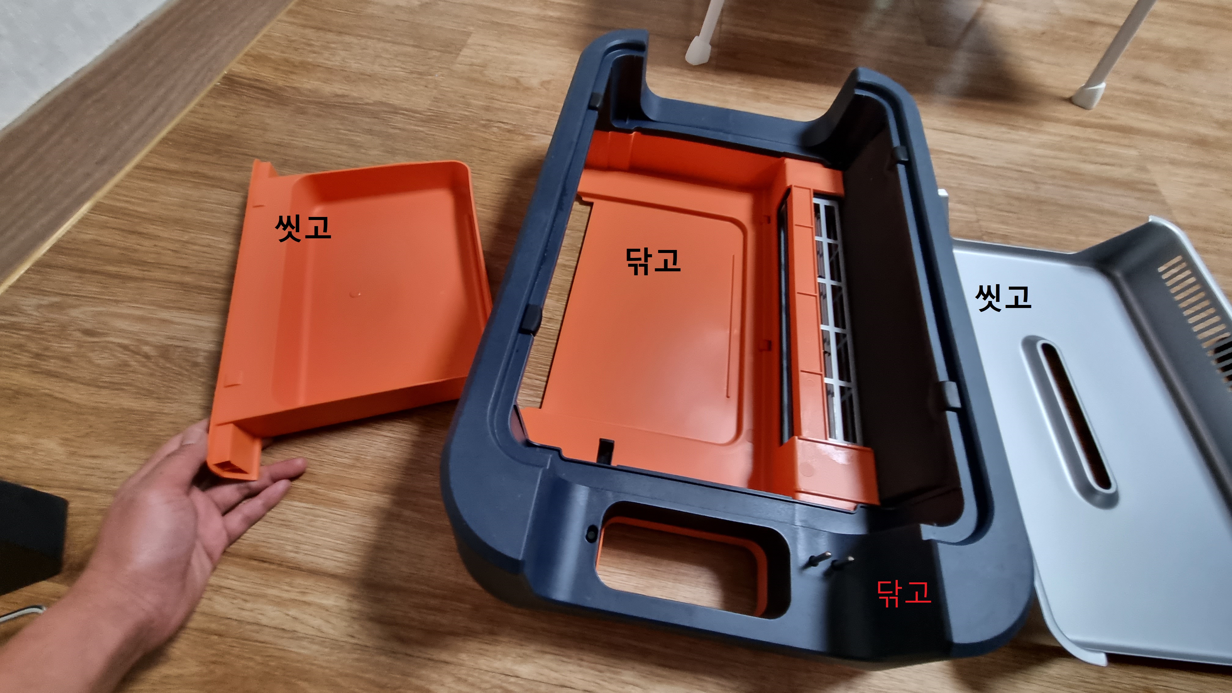사용한 팬을 제외하고도 닦아야 할 용기들이 너무 많아요. 팬, 기름받이, 기름 유도판, 본체, 온도 조절부에 튄 기름 등등. 생각보다 세척하기 너무 번거로워요. 홈쇼핑에서는 너무 쉬운 세척이라고 하죠. 하지만 그렇지 않아요. 실제 사용해 본 결과 세척이 너무 번거스러워요. '지금 누구 즐겁자고 집에서 고기를 구웠나?!' 이런 생각이 들어요. 크기도 커서 12인용 세척기에 넣기도 부담스럽고 세척기에 넣어도 되는지도 모르겠네요.