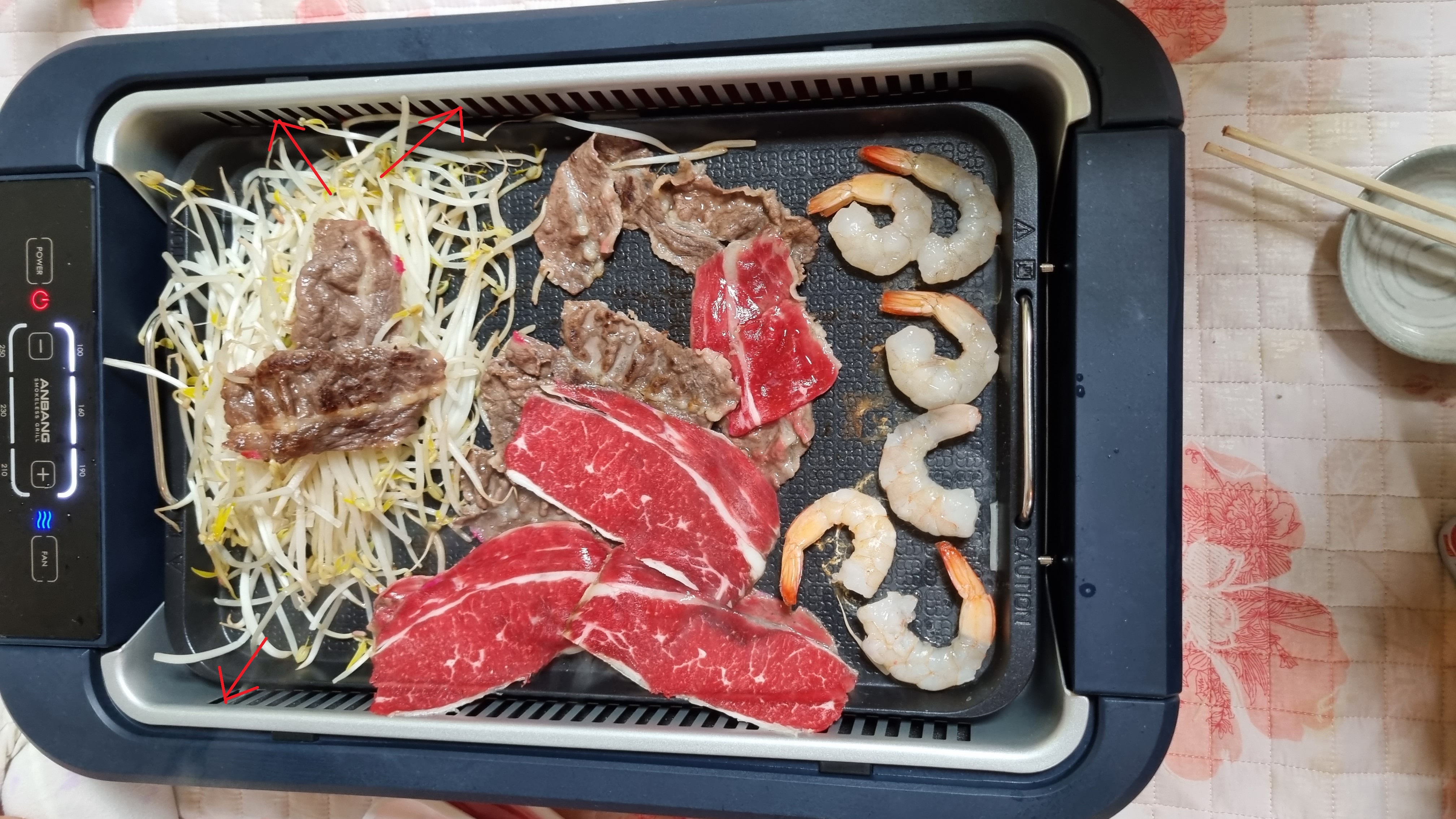 크기는 사실 개인적인 차이가 많아서 좋다, 나쁘다라고 말하기 힘들어요. 필자는 어른3+아이2와 함께 먹었는데 부족함이 없었어요. 어른은 평균 200g의 고기 정도만 먹고 아이들은 새우와 고기 몇조각 먹는게 전부거든요. 천천히 오래 먹는 스타일이라면 안방그릴을 추천하지만 대식가는 솔직히 안방그릴 비추에요.