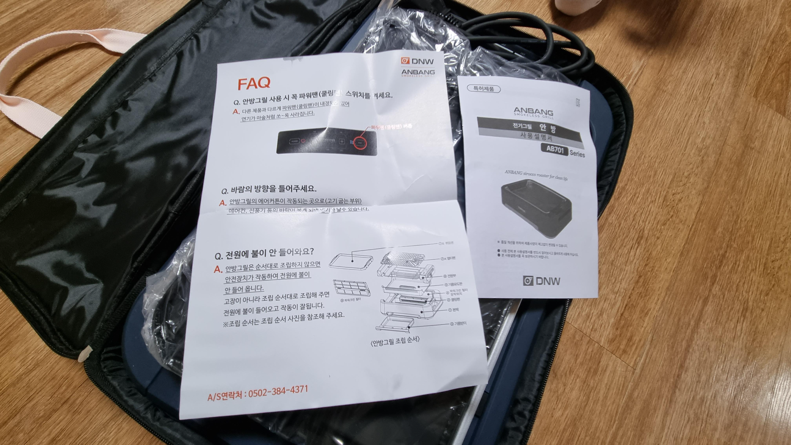 일단 설명서가 들어 있어요. 기계치들은 제품을 사용하기 전에 제품의 사용설명서를 먼저 읽는 것을 추천드려요. 팬 버튼 안 누르고 "이거 왜 연기 나지?" 이러는 사람 분명 있을 거예요. 저도 그랬거든요.