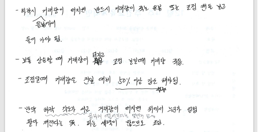 올라가는 엘리어트 1파 자리에서는 개미털기나 흔들기가 존재한다고 했어요. 그렇다면 개미털기에 당하지 않으려면 거래량을 확인해야 한대요. 개미털기나 흔들기의 가장 큰 특징은 거래량이 없다는 거예요. 보통 상승할 때 거래량이 터지고 조정을 보일 때 거래량이 적은 게 특징인데 이 거래량이 조정 기간일 때는 전일 대비 50% 이상 감소하는 게 좋다고 했어요. 단테 아저씨가. 하락 시 거래량이 터지면 진짜 하락이래요. 하락시 음봉에서 거래량이 터지면 반드시 거래량이 죽는 음봉 또는 조정 캐들 보고 들어가야 된다고 했어요. 만약 하락 각도가 서고(급하게 떨어진다는 뜻인 거 같음) 거래량이 터지면 위에서 누군가 엄청나게 팔아 재낀다는 뜻으로 파는 세력이 많으므로 조심해야 된다고 했어요.