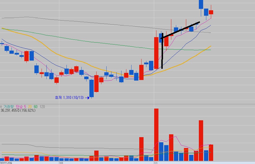 위의 차트도 매집봉 보이고 캔들의 몸통 중간인 거 같아서 매수를 했어요. 거의 손절가에서 잡아서 손절 라인은 짧고 수익 라인은 길게 잡을 수 있는 손익비 좋은 차트 같았어요. 그런데 아직 시세가 나오진 않아요. 단테 아저씨가 손절은 짧고, 수익은 길게 나올 수 있는 종목이 손익비 좋은 차트라고 개꿀이래요. 필자의 생각으로는 위의 차트가 개꿀로 보여요. 시간이 지나 보면 알겠지만...